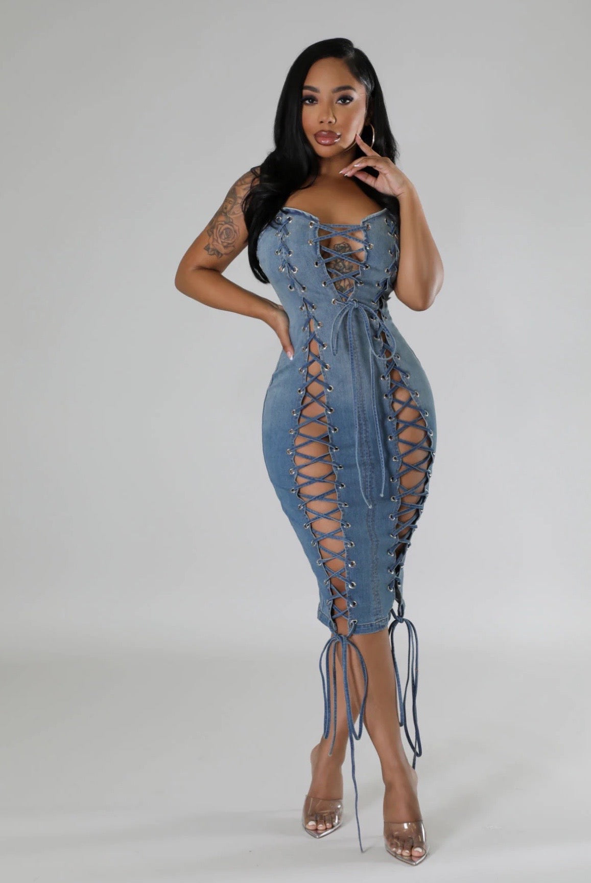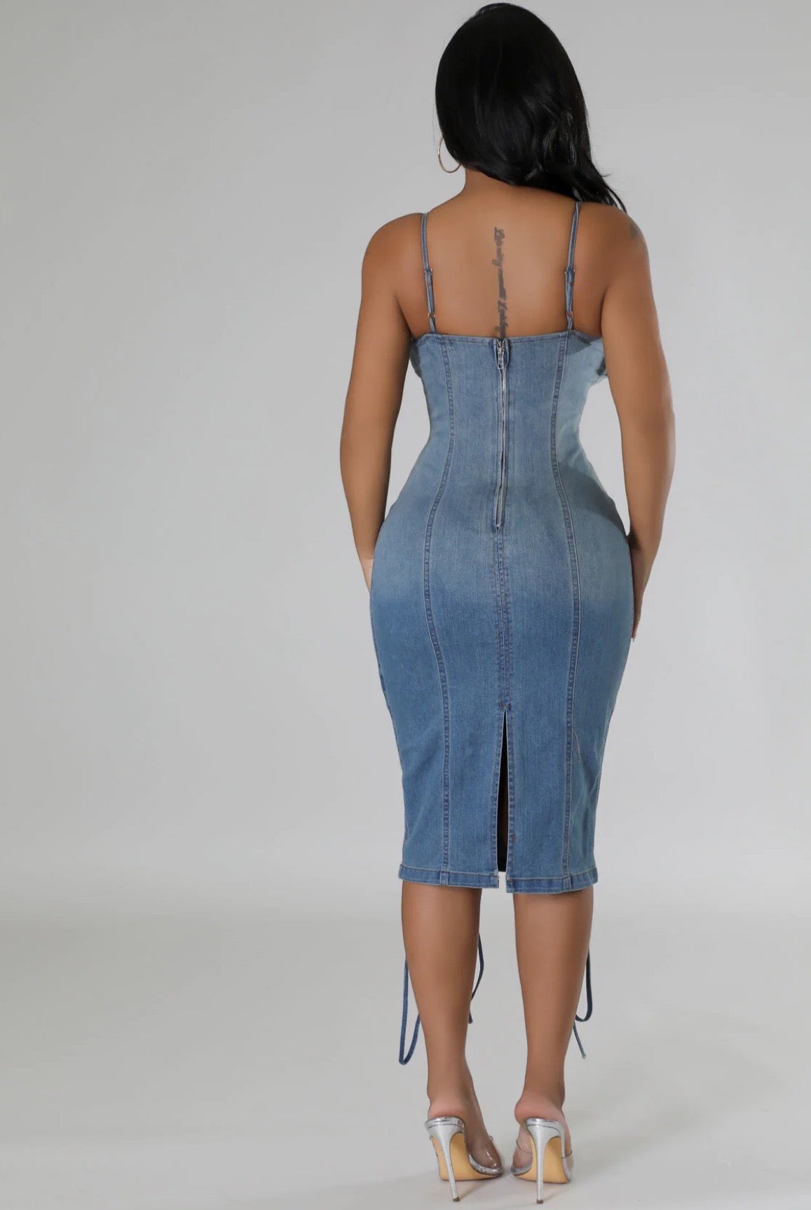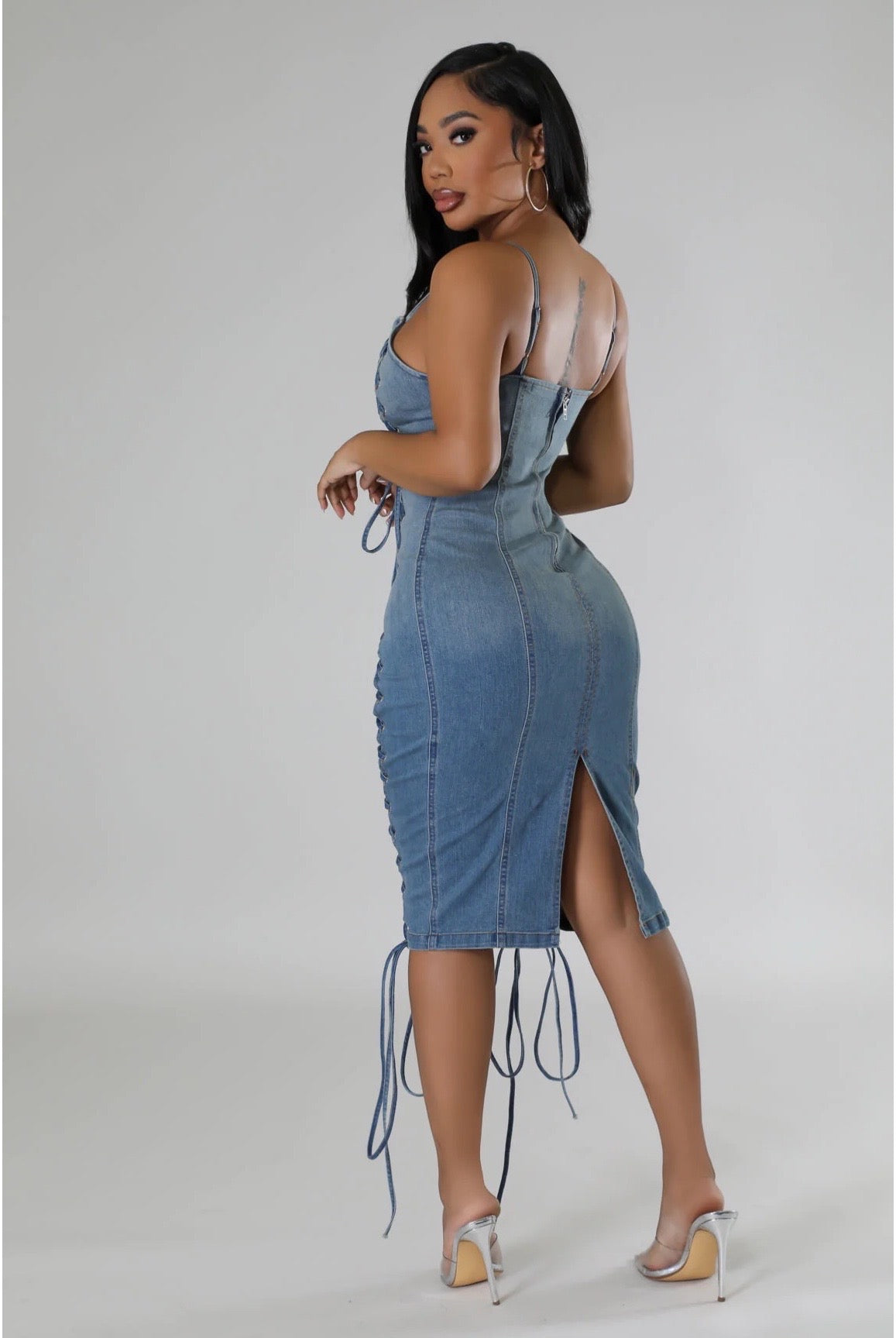 Turn heads in this ultra-sexy denim midi dress designed to sculpt your curves and elevate your confidence. Featuring adjustable spaghetti straps and double side lace-up details, this piece offers the perfect mix of edge and versatility. The exposed back zipper adds function while the stretch denim hugs in all the right places.