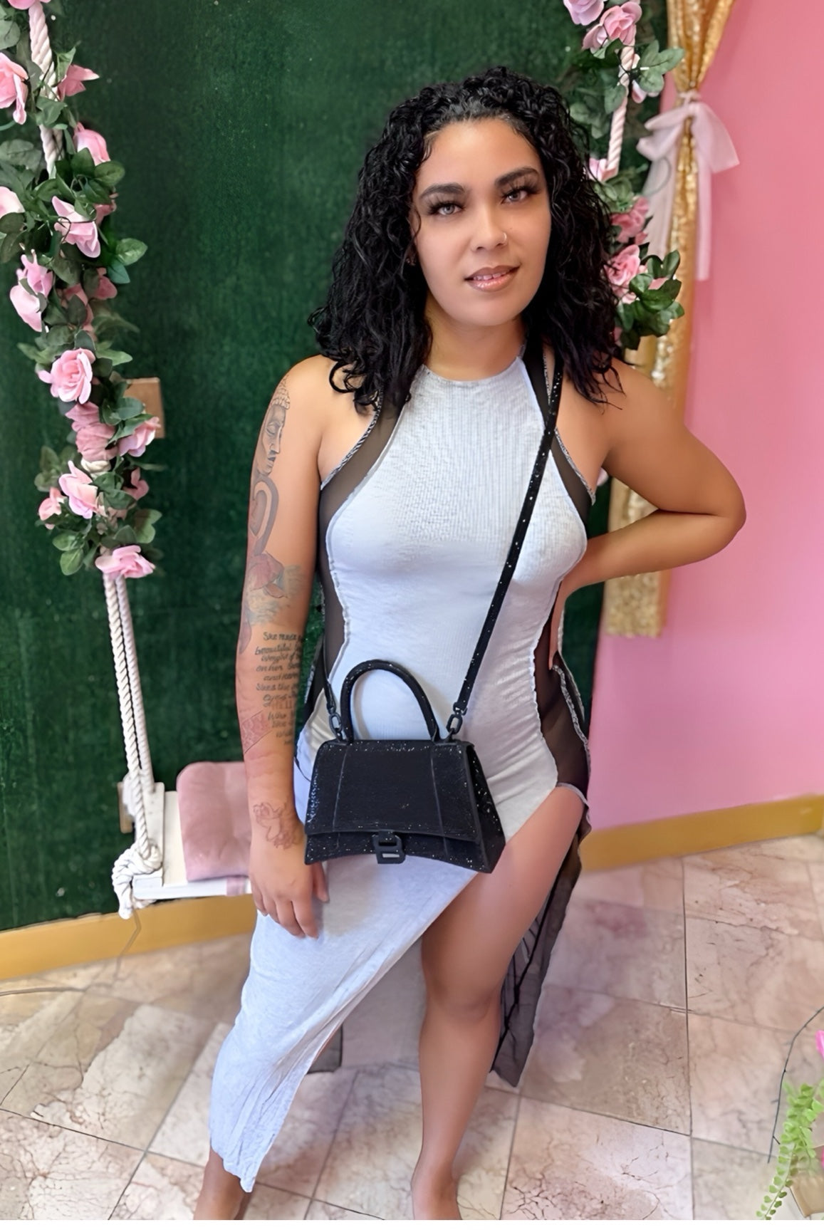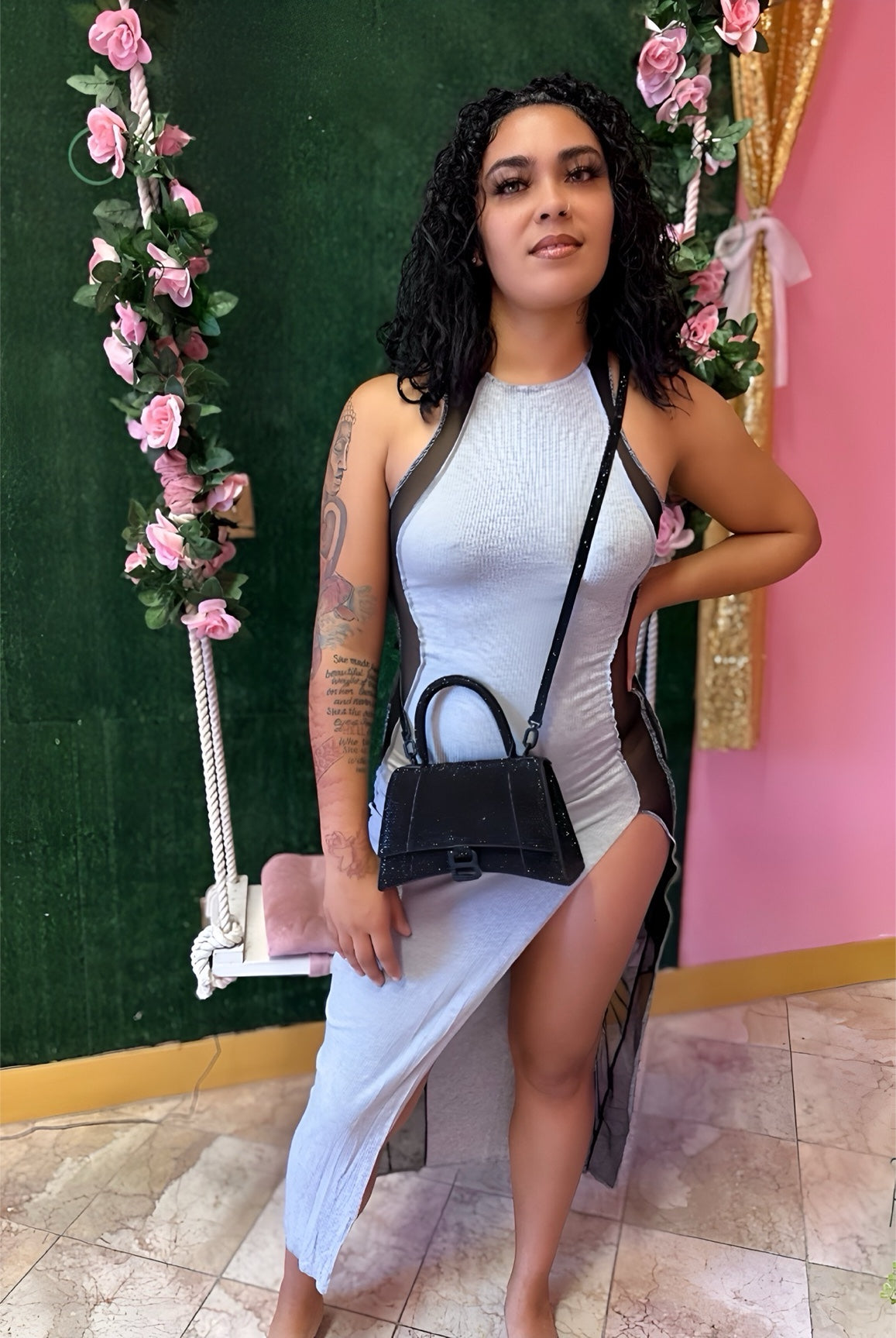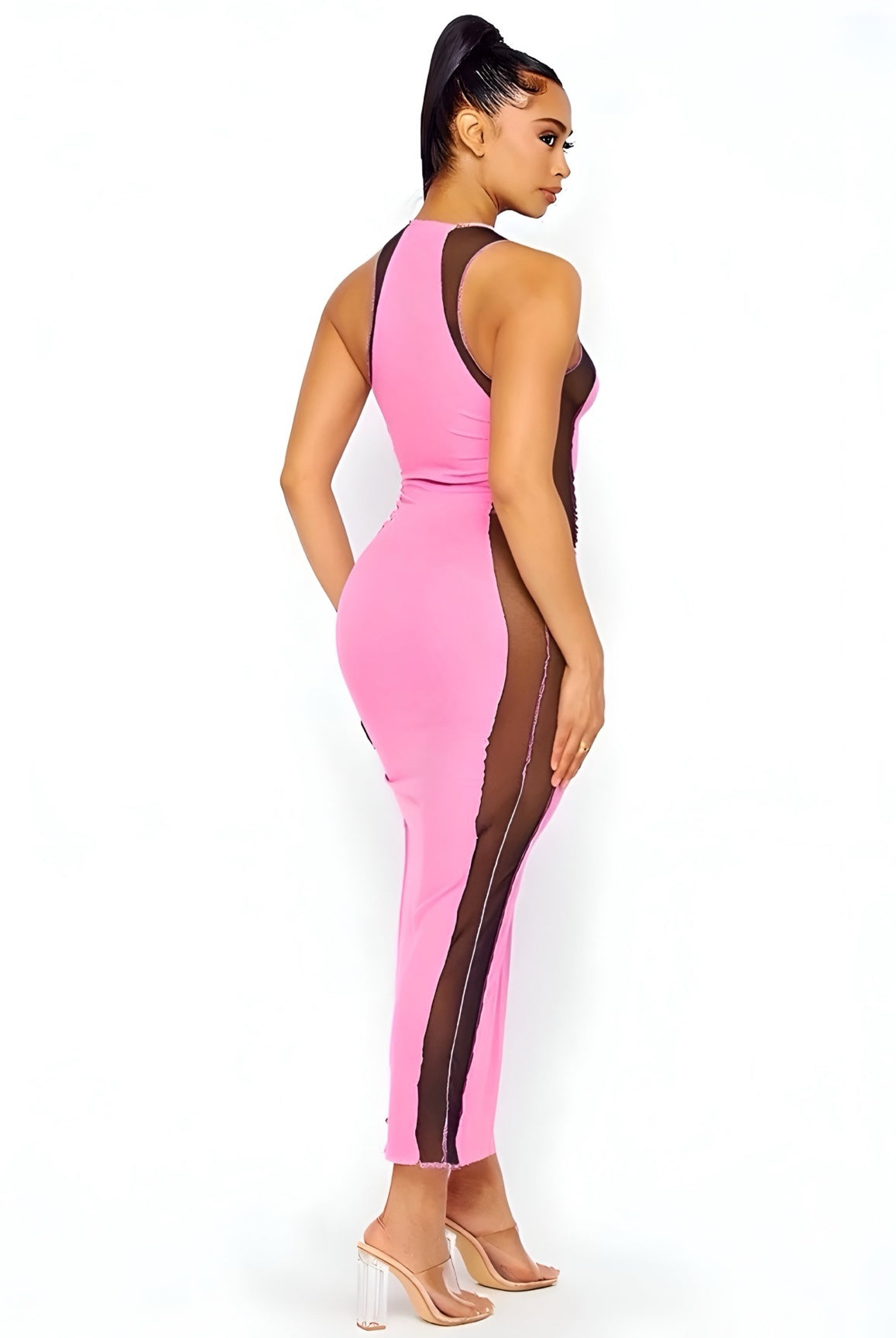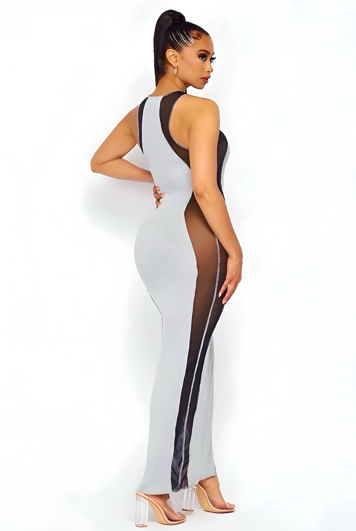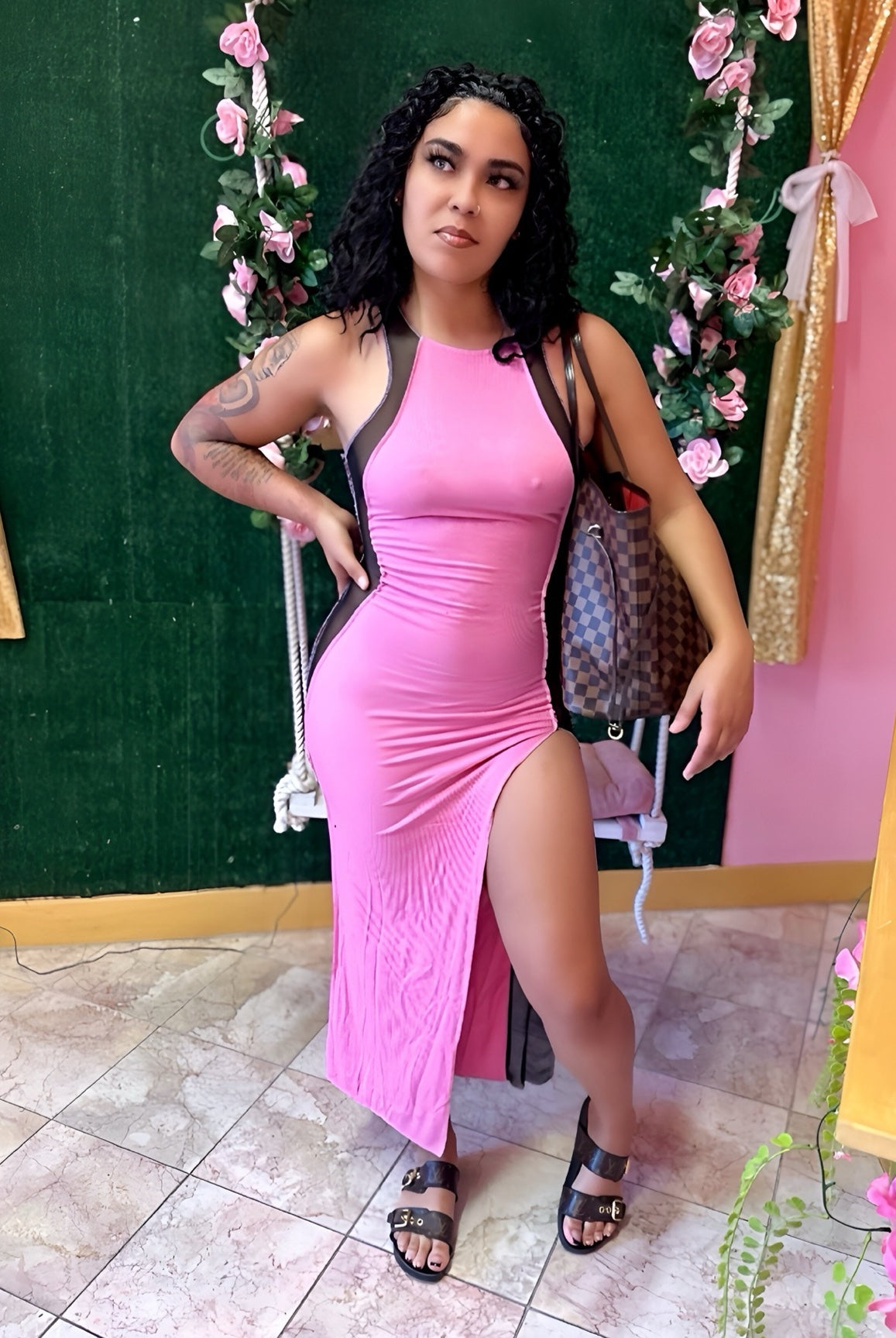 This sleeveless ribbed maxi dress brings bold energy with its double mesh side strip detail and high side split. Designed to hug your curves with its stretchy ribbed fabric, it offers both comfort and statement style for any night out or weekend slay.