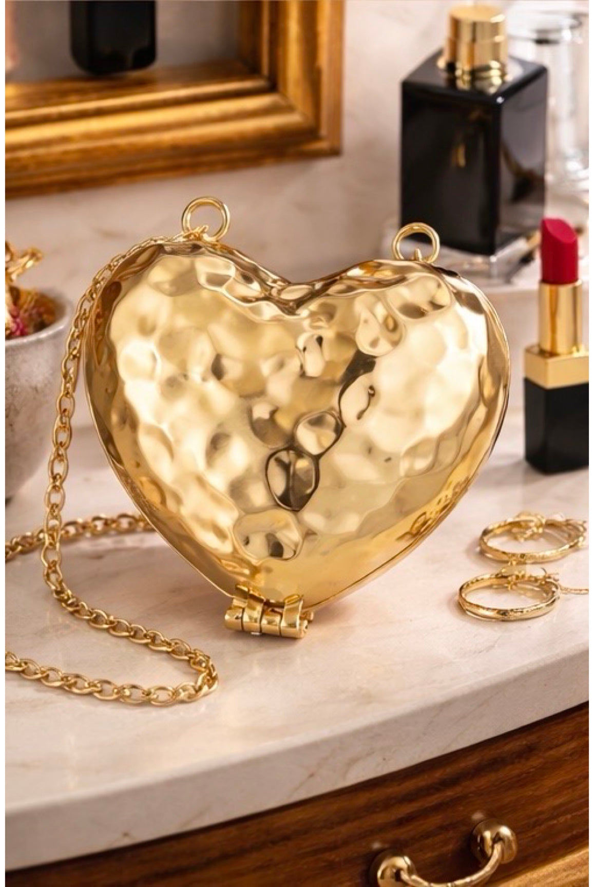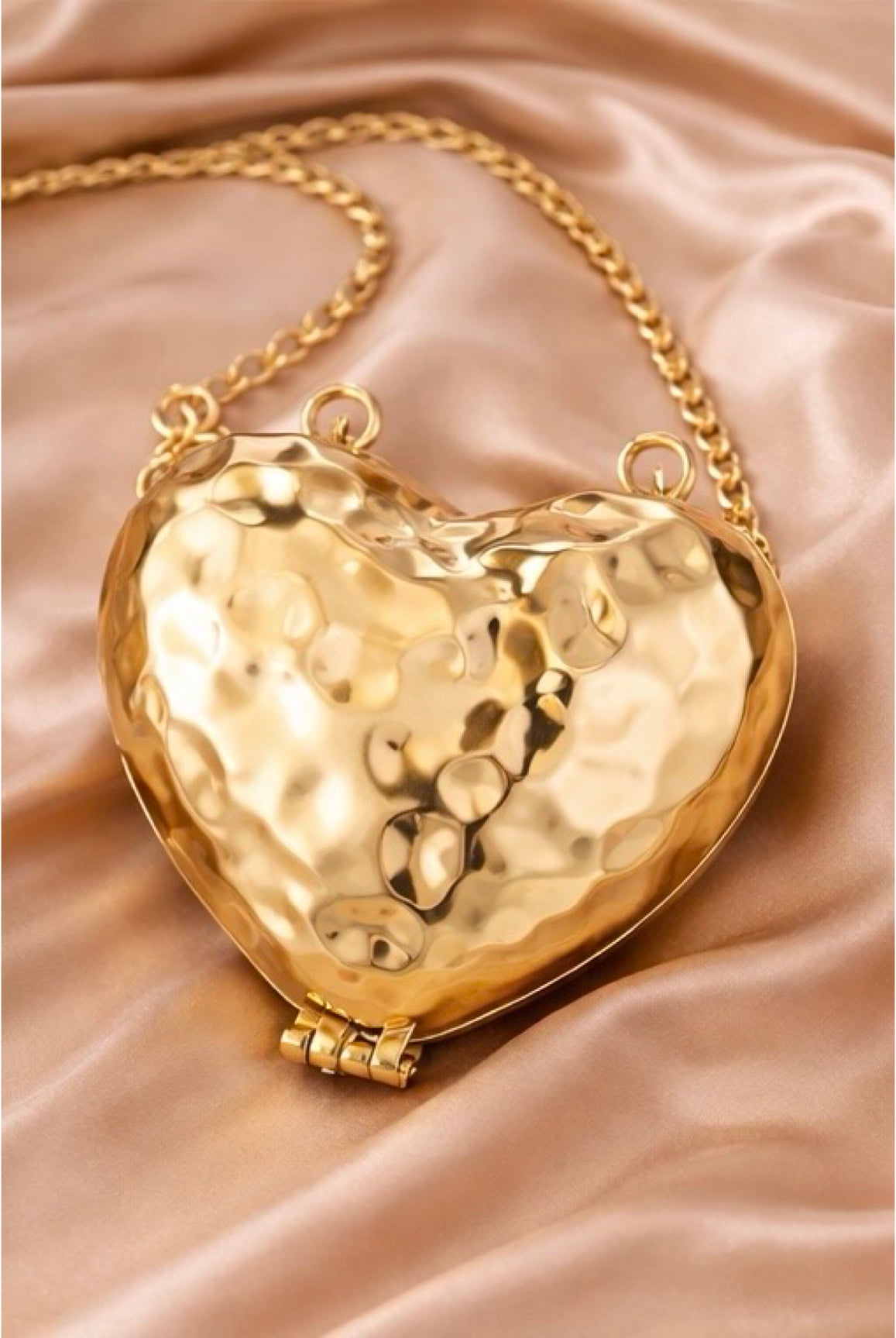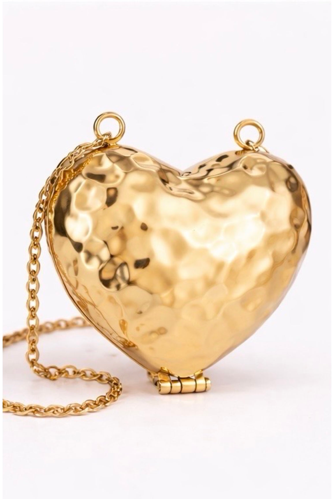 Fall in love with the details. The Heart Shaped Hammered Metal Coin Purse is the statement accessory you didn’t know you needed. With its luxe hammered texture, metallic gold finish, and chain strap, this purse brings a bold vintage vibe that turns any look into a full slay. Compact and lightweight with just enough room for your coins, gloss, and keys — she’s small but mighty.