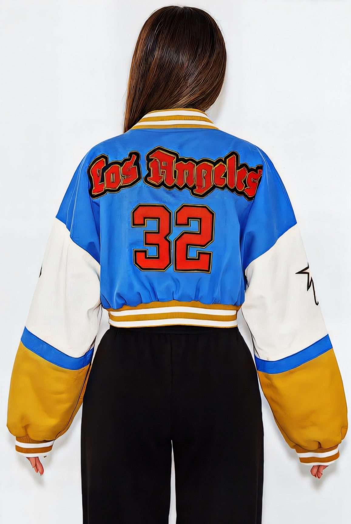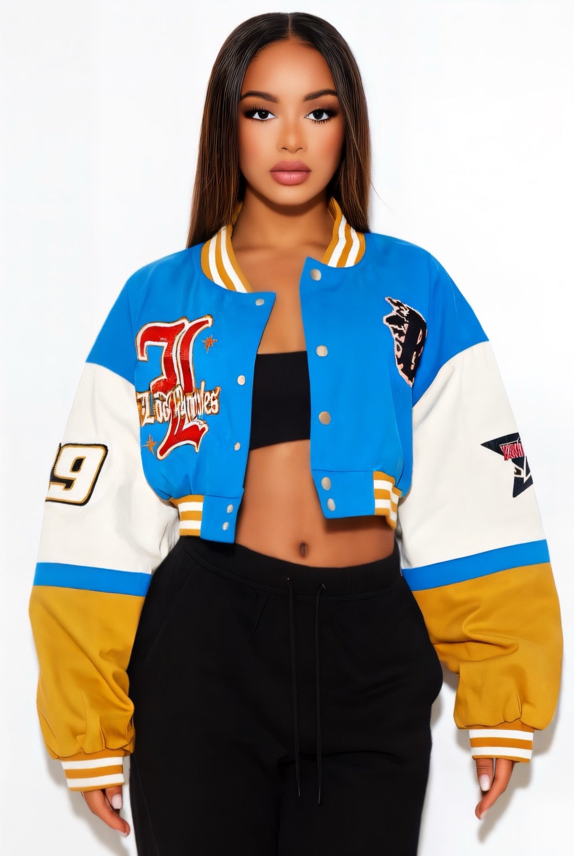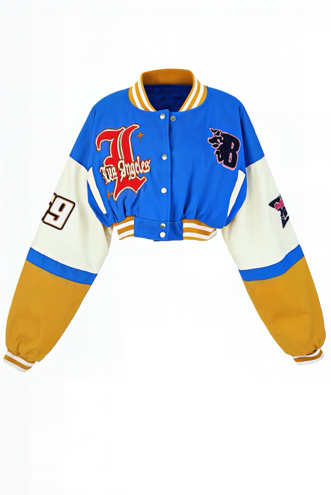 Turn heads in this bold cropped varsity jacket featuring statement patches and classic color-block style. The front shows off “Los Angeles” with a fiery “B” logo, while the sleeves rep Brooklyn and 69-star accents for that East-meets-West energy. Designed for comfort and confidence — this piece brings major streetwear vibes to any look.