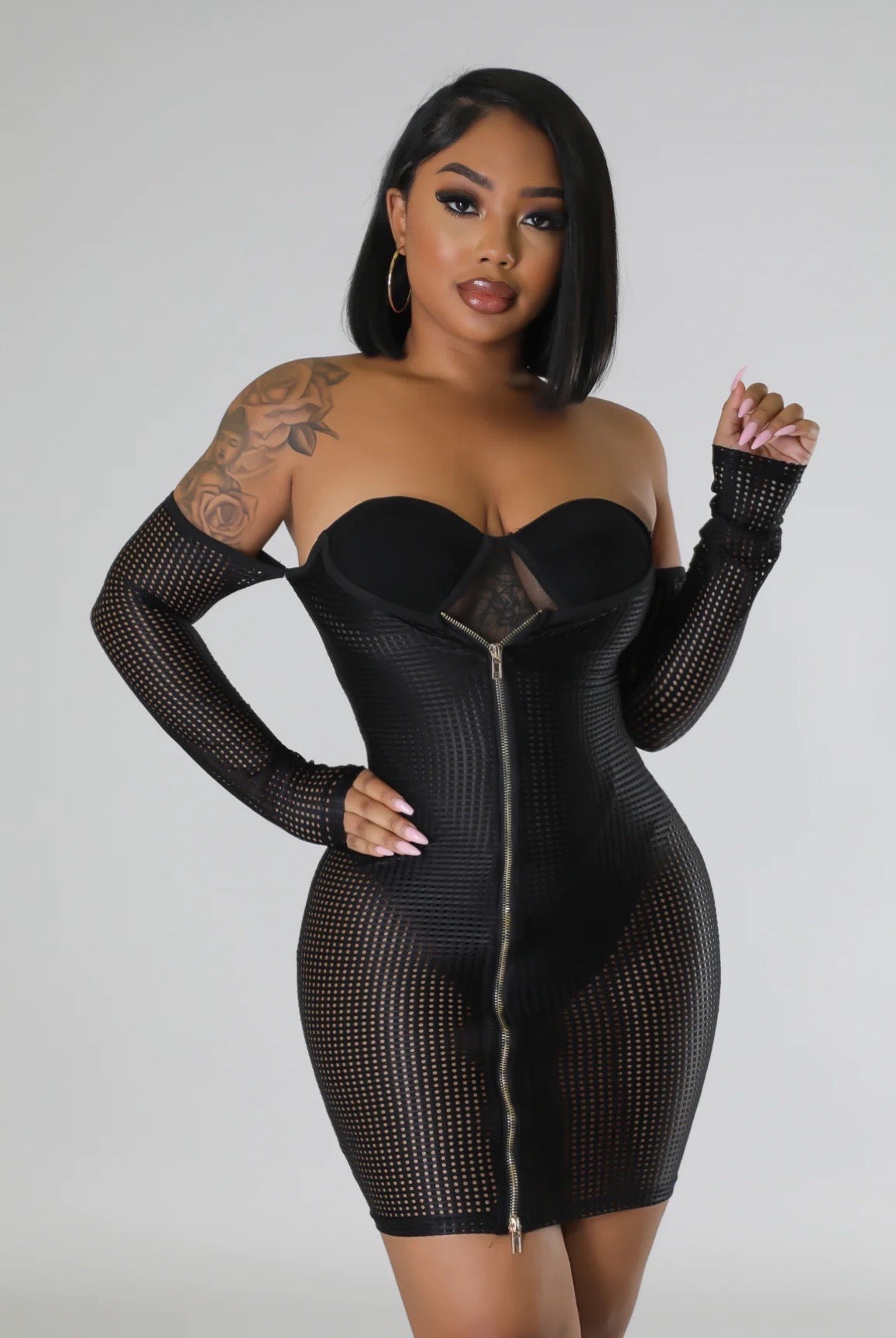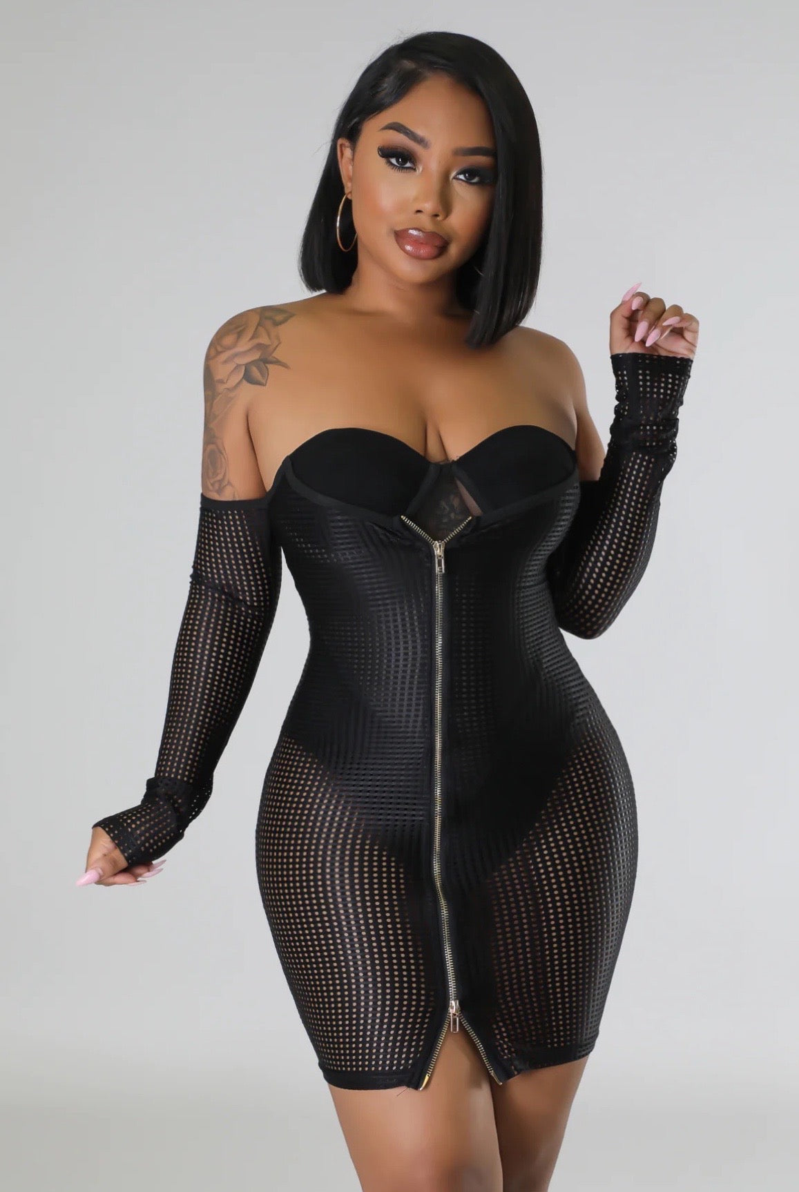 - Details: Sheer mesh overlay, attached bodysuit, and zipper closure