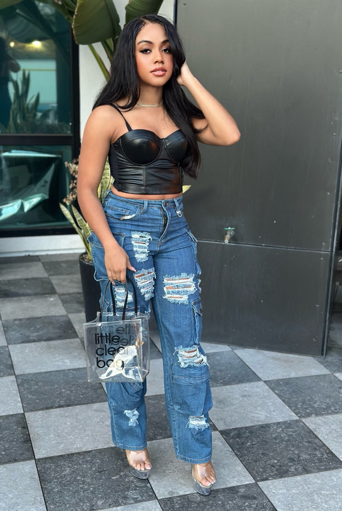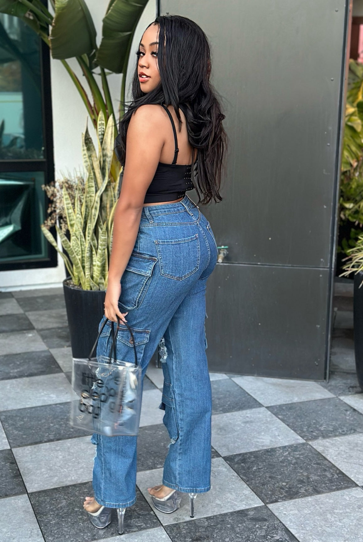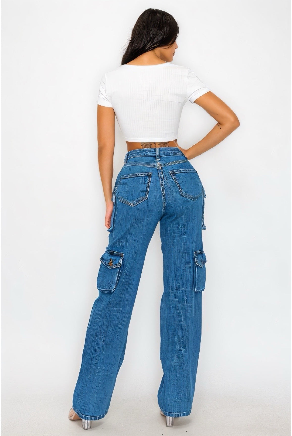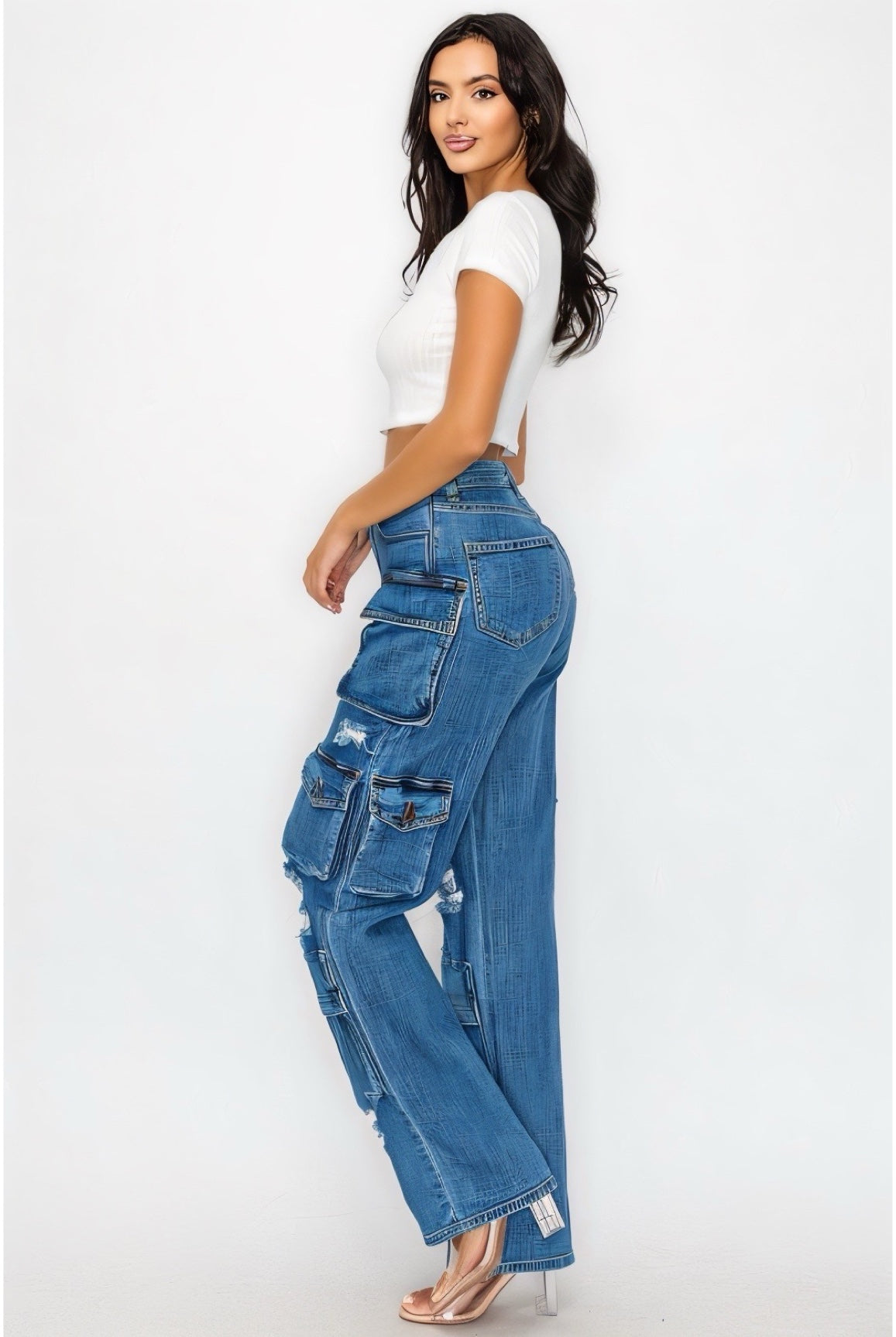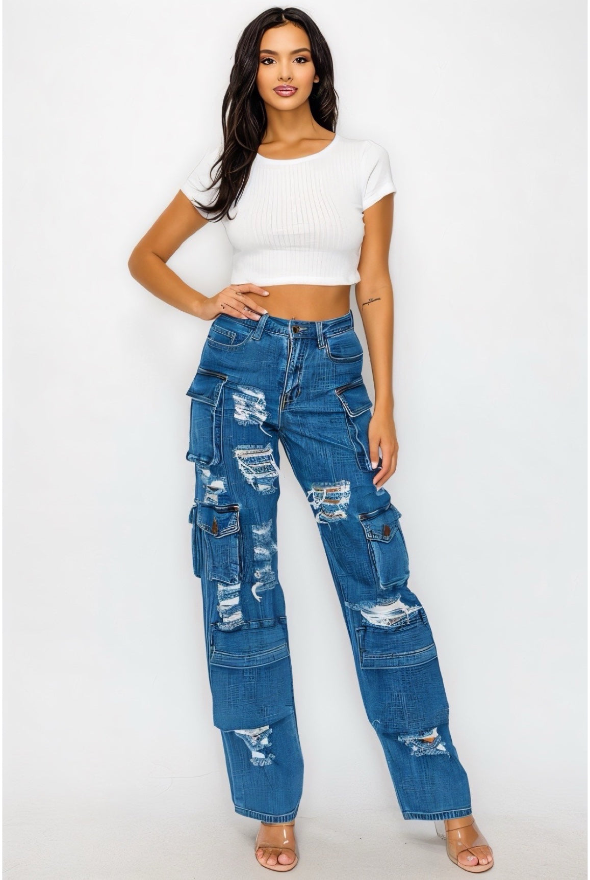 Get ready to take on any adventure in style with our Mercy Distress Cargo Pants! These high-rise pants feature extra front panel cargo pockets for added storage, while the distress finish adds a rugged edge. The good stretch ensures a comfortable and flexible fit for all-day wear. Perfect for the fashion-forward and adventurous individual.