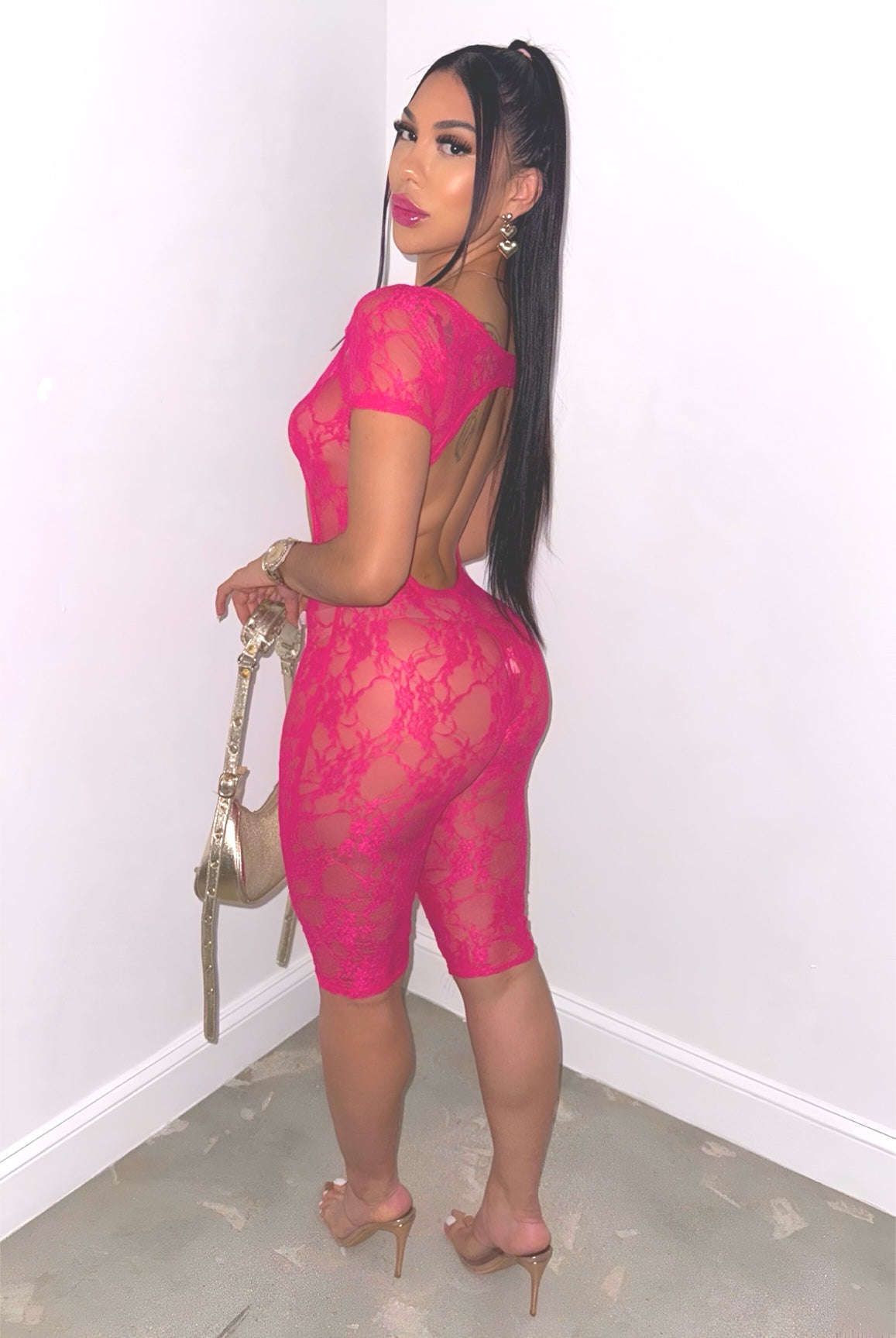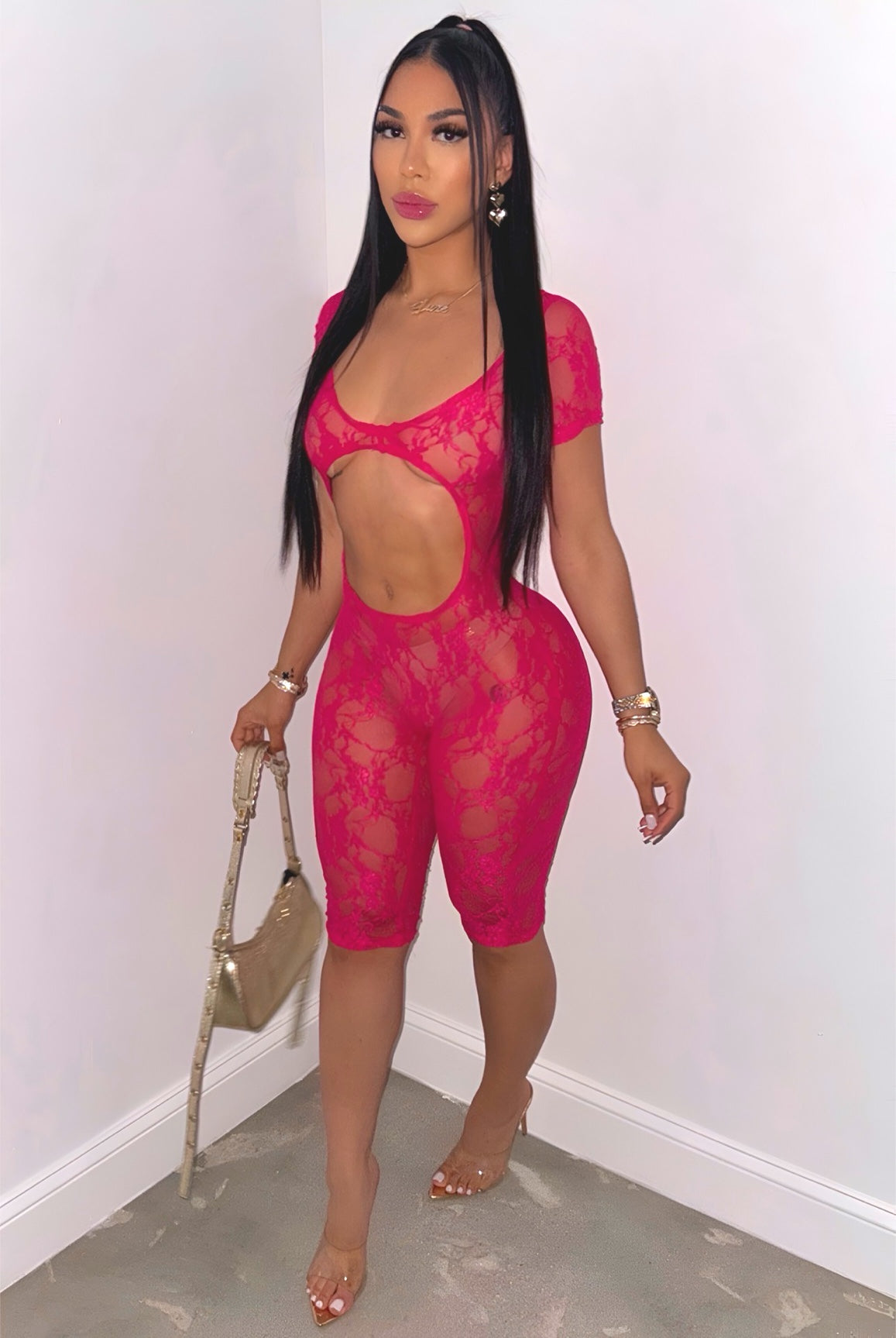 Step out bold in the Risk It All Lace Romper. This curve-hugging one-piece features stunning floral lace with a flattering wide neckline, short sleeves, and daring cutouts at the front and back. The stretchy fabric ensures a sleek, comfy fit that moves with you while serving major looks. Perfect for nights when you’re feeling confident, sexy, and unapologetic.