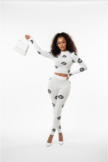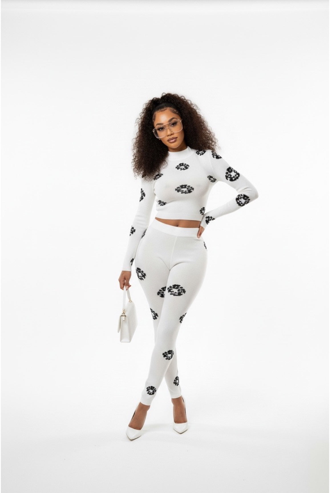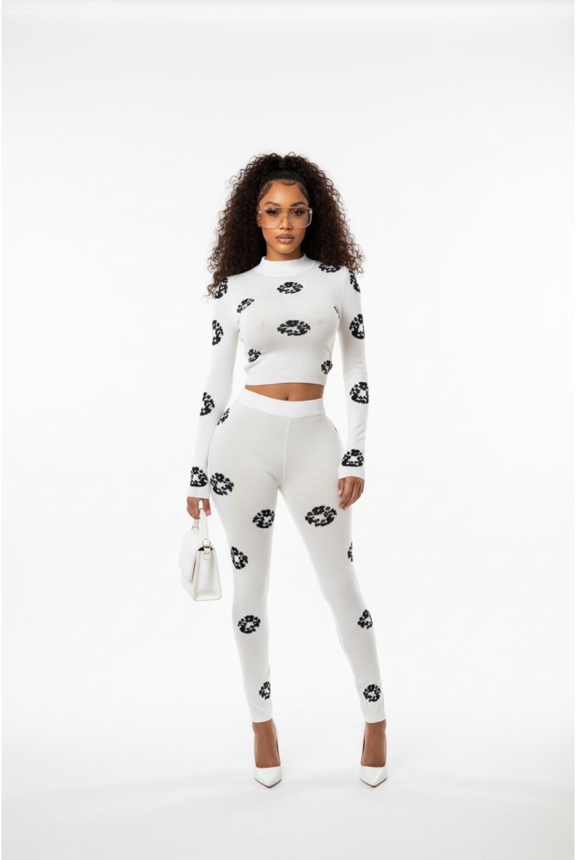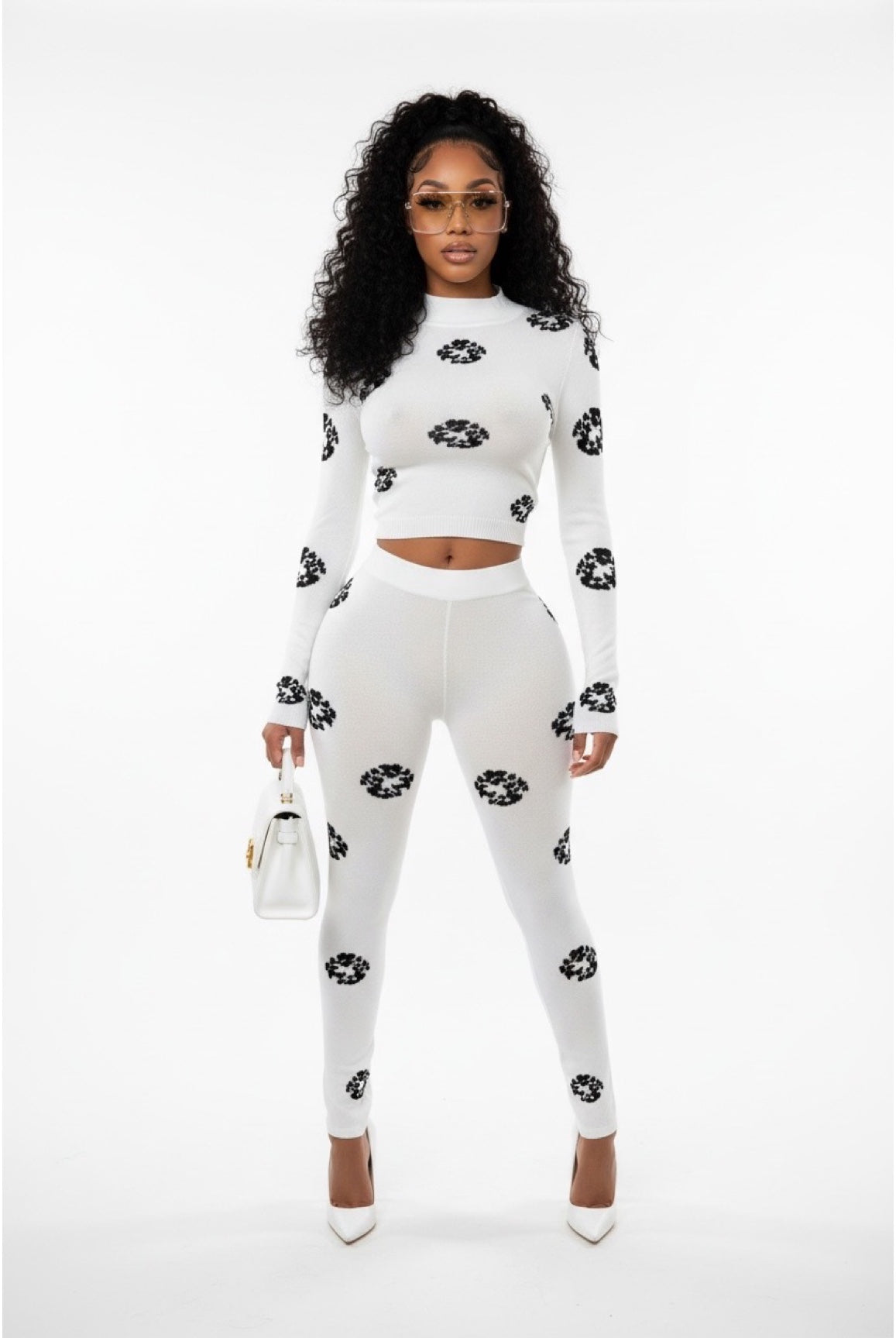 The Not Even Trying Set is a soft knit two-piece featuring a long sleeve cropped top and high-waisted leggings in a bold spotted print. Designed to hug your curves while keeping you comfortable, this set gives relaxed luxury with body-contouring stretch.