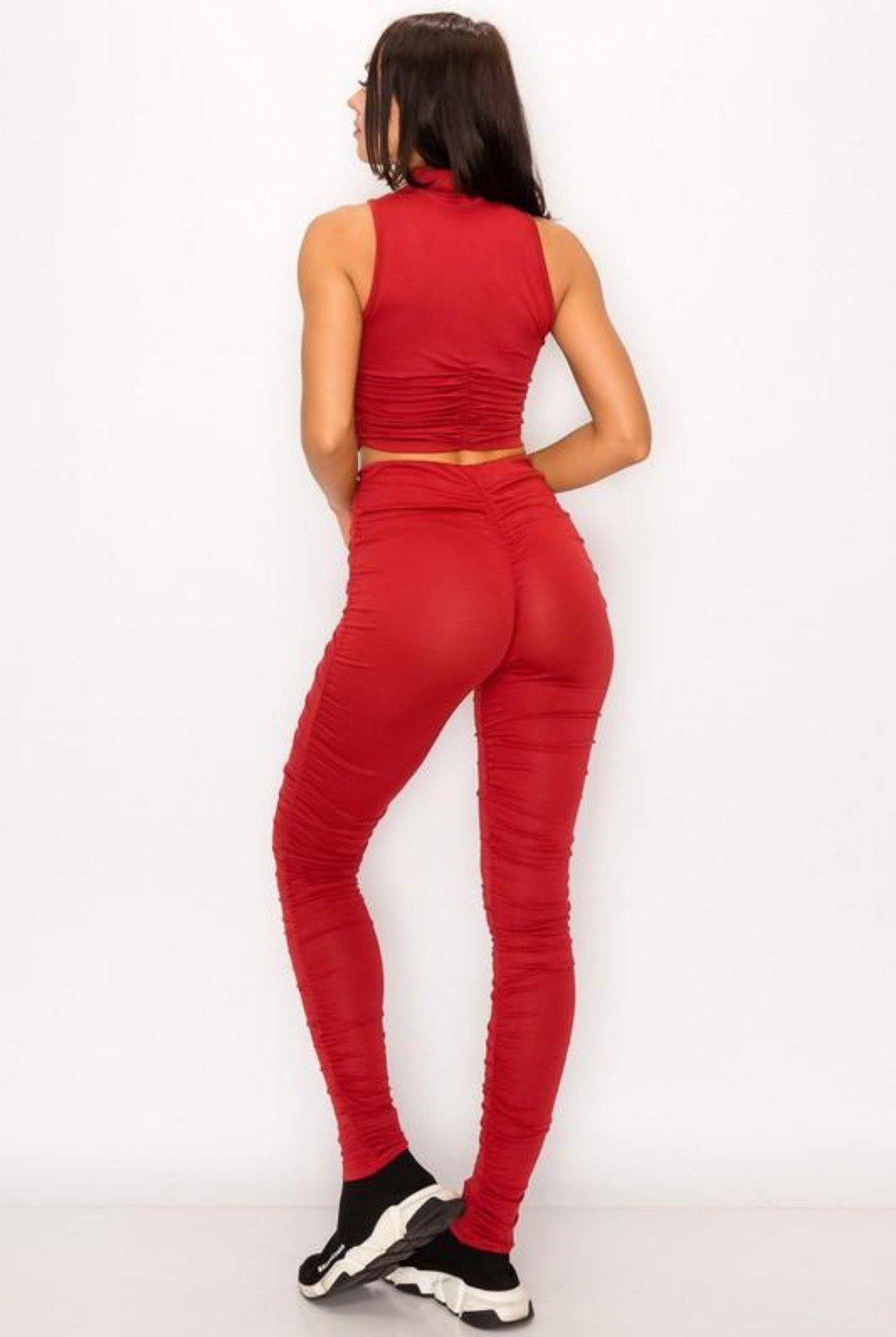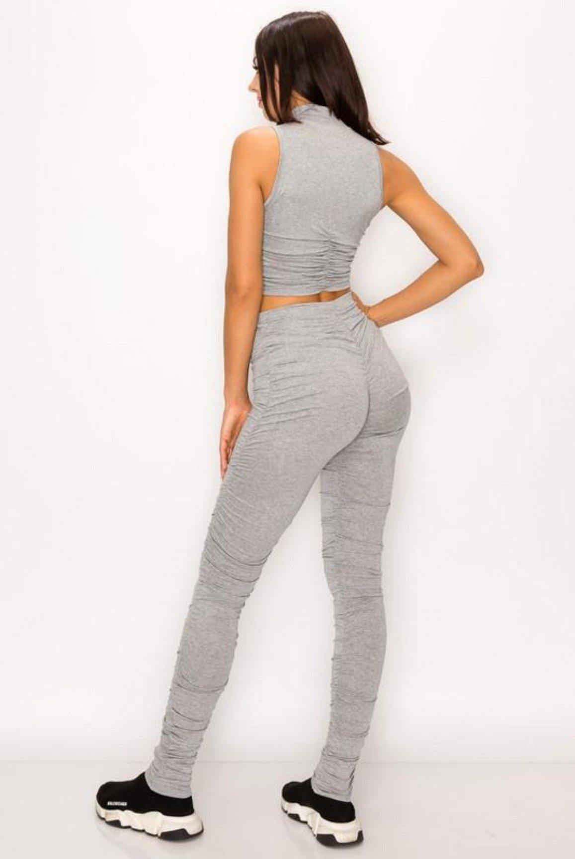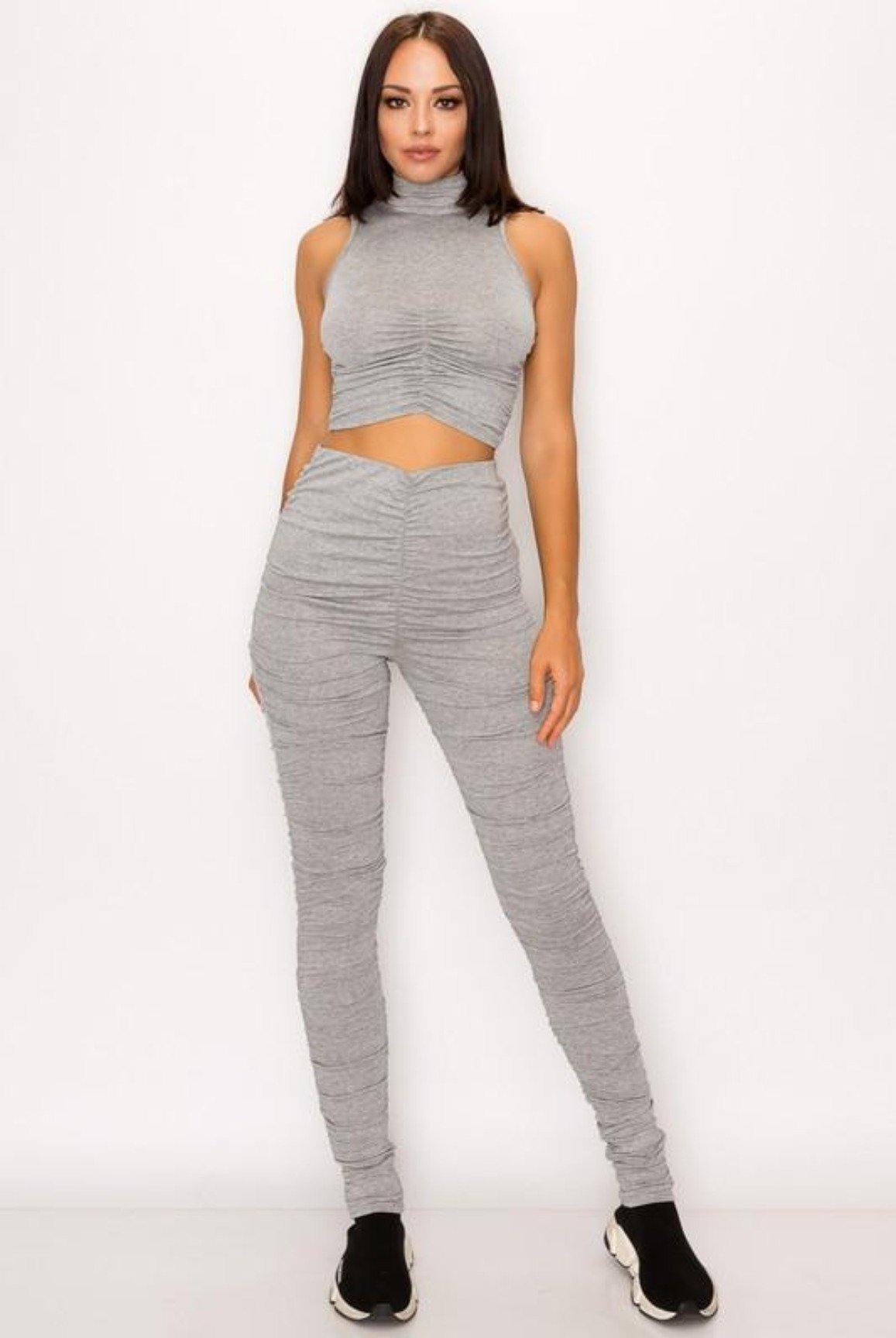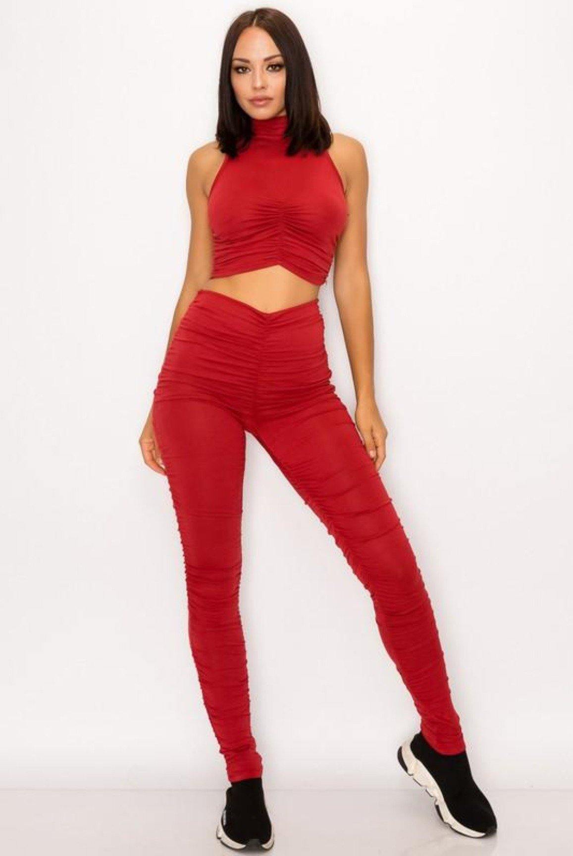 - Matching ruched pants and mid ruched crop top