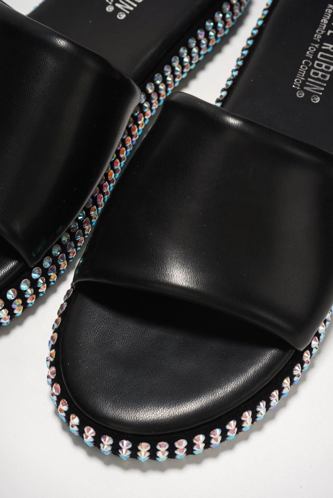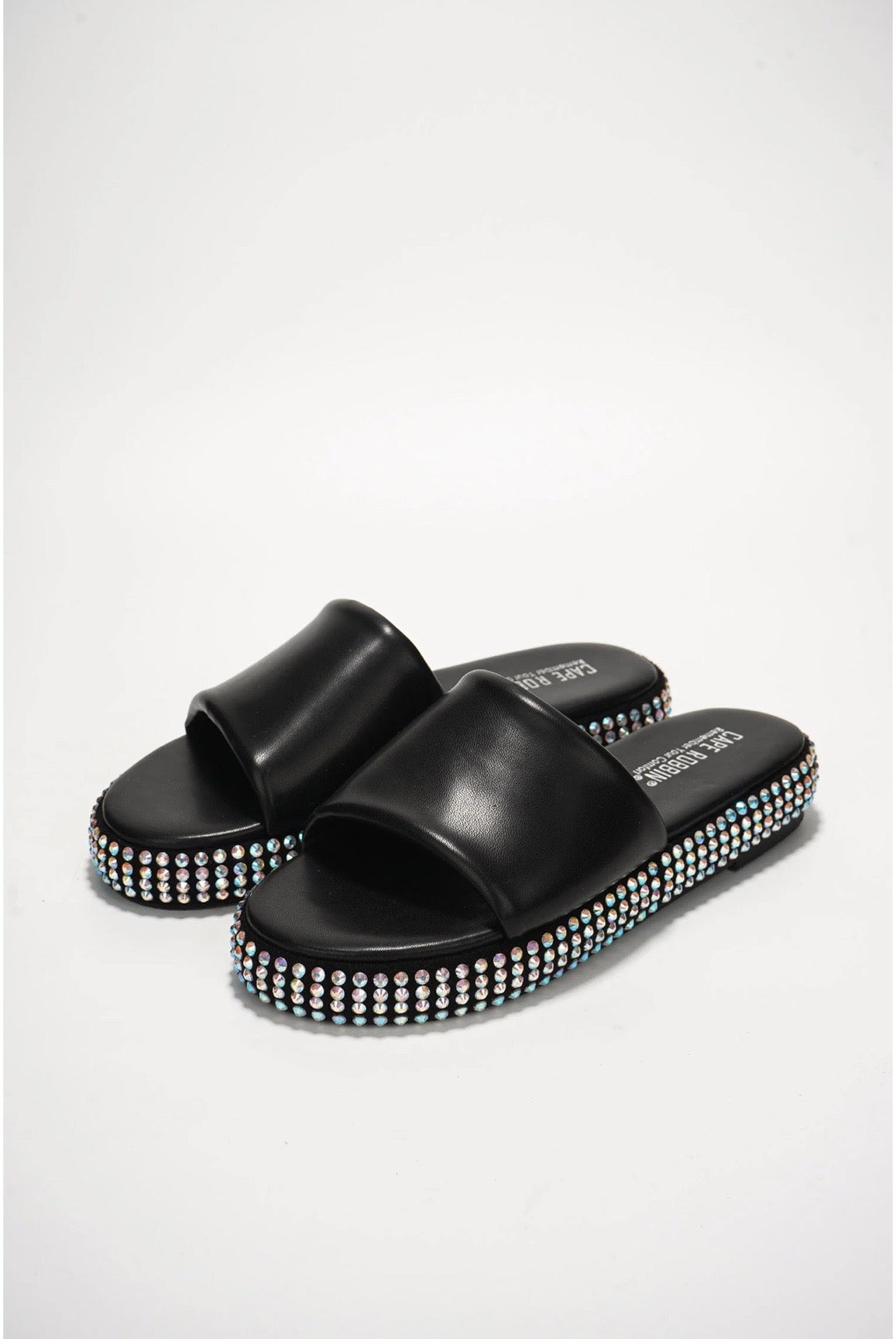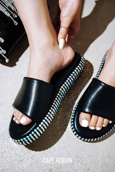 Step out in style with the Damdam sandals by Cape Robbin. These round toe, flat slide sandals feature a rhinestone coated midsole that will catch everyone's eye. Made with wide feet in mind, they also offer a comfortable fit, thanks to the PU flat footbed. Perfect for any occasion, these sandals add a touch of glamour to your outfit.