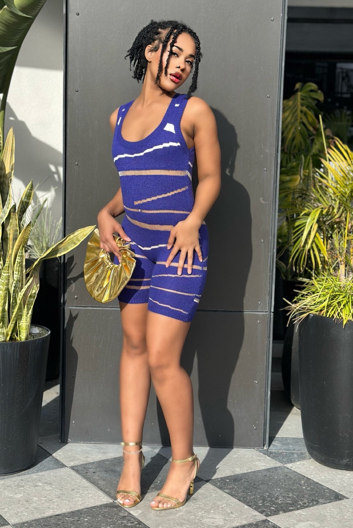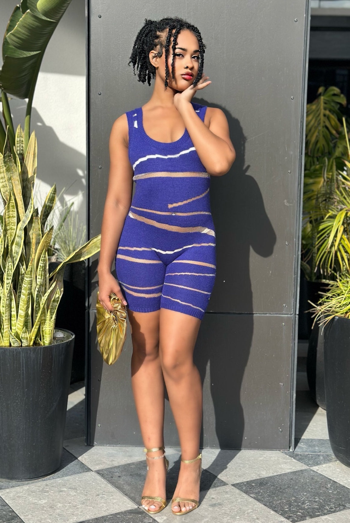 Step out in confidence with the Don’t Play Wit It Knit Mesh Romper. This sleeveless one-piece features a body-hugging stretch fit with bold mesh detailing for a standout streetwear look. The tank-style top and soft knit fabric keep it comfortable while the contrast design adds a trendy edge.\