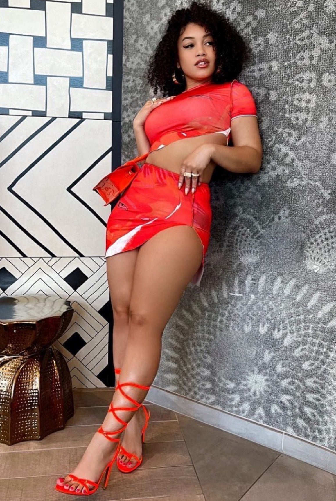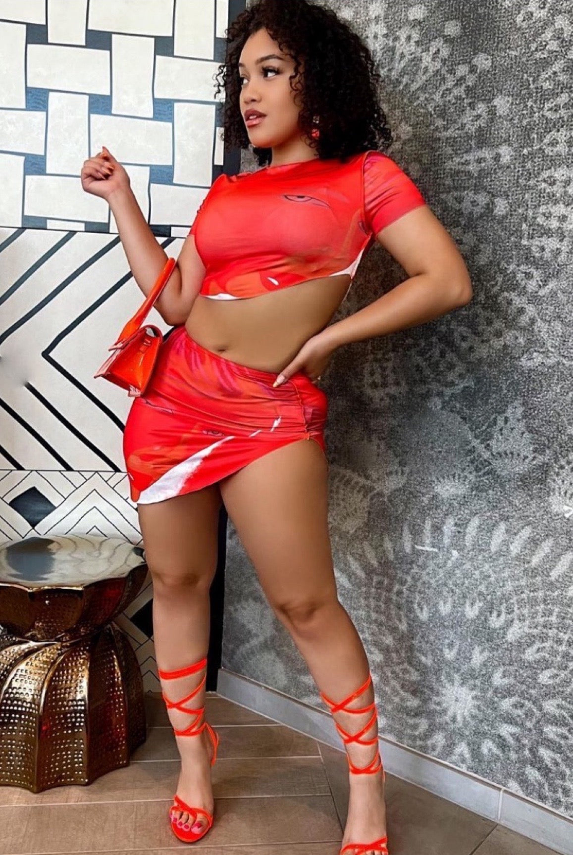 - Details: High-slit mini skirt, matching graphic crop top