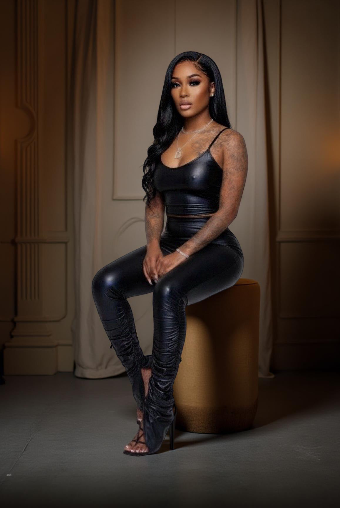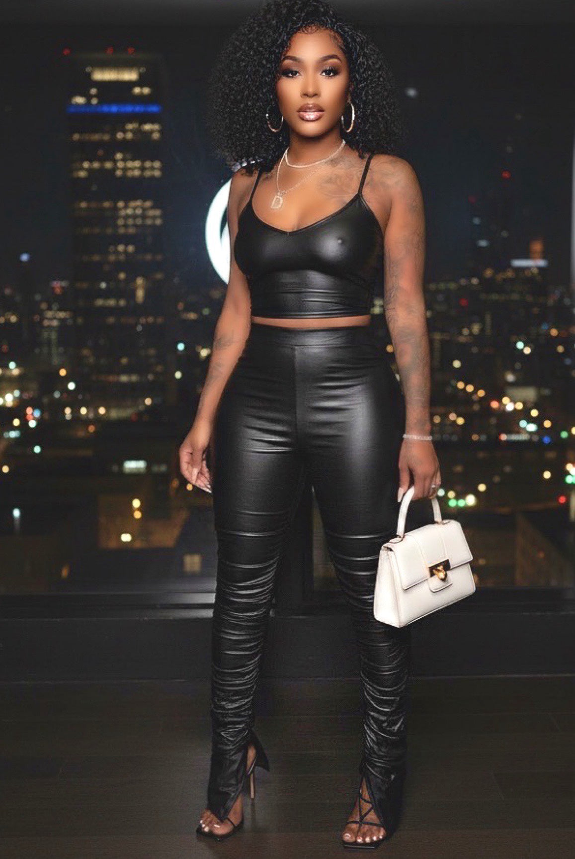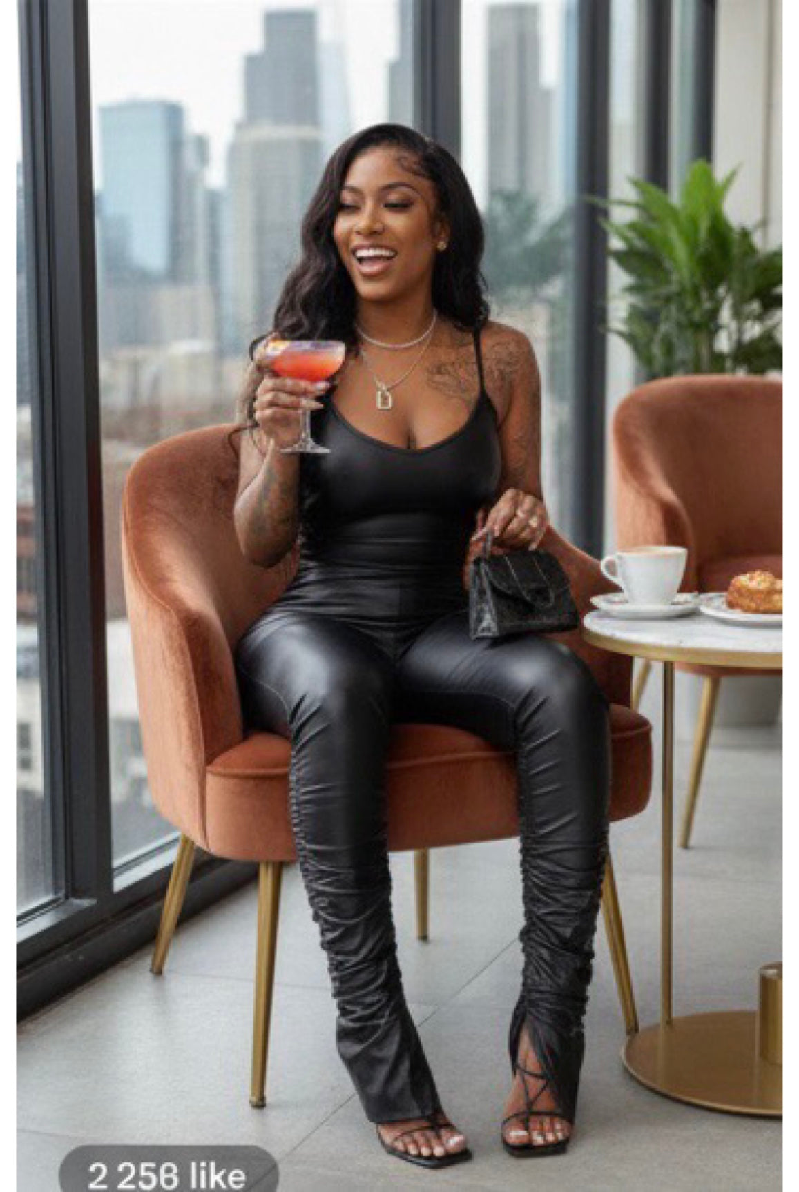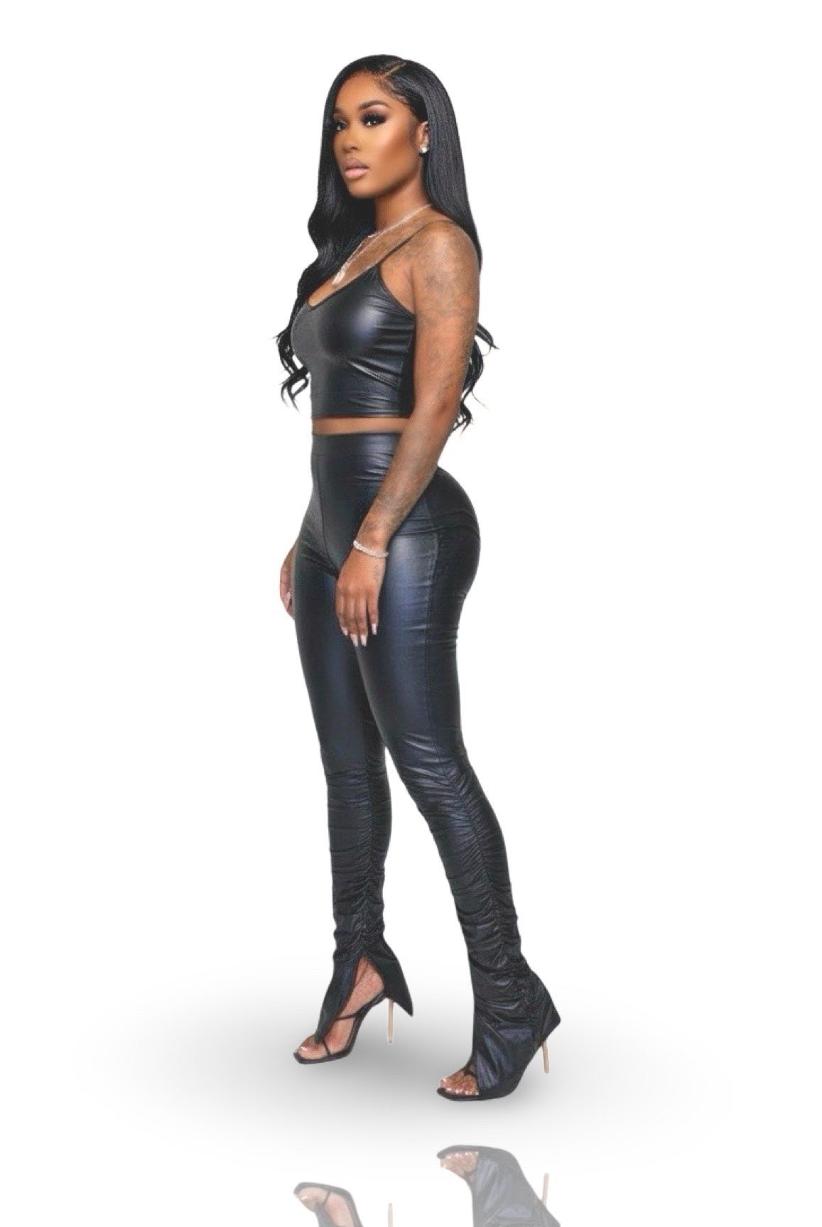 Bring the heat wherever you go in the Midnight Mood Faux Leather Set — the ultimate power look for baddies who don’t do basic. This two-piece includes a curve-hugging cami crop top and matching ruched skinny pants that snatch the waist and sculpt your shape from every angle. The smooth leather-look finish gives luxe energy with just the right amount of stretch for all-night comfort.