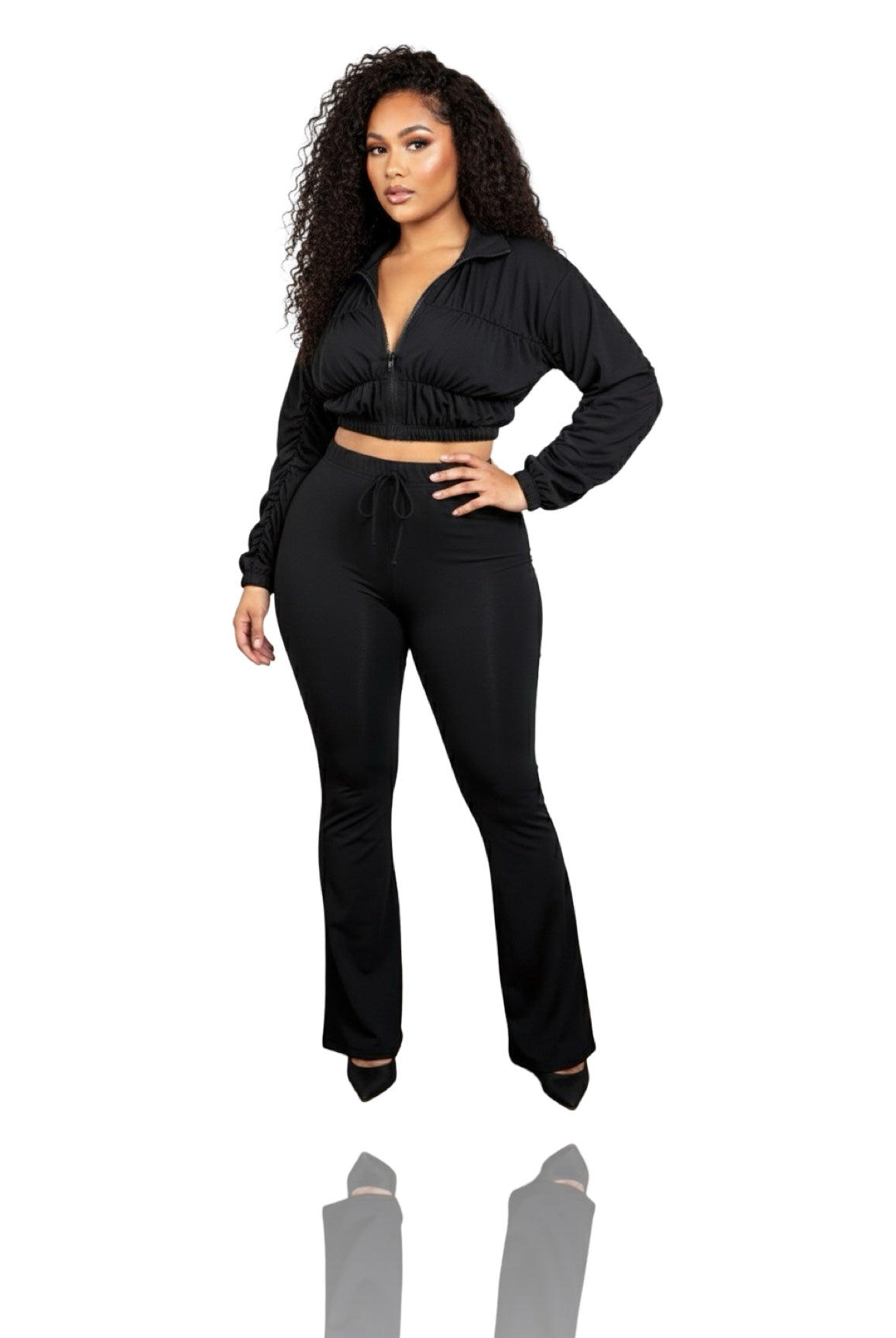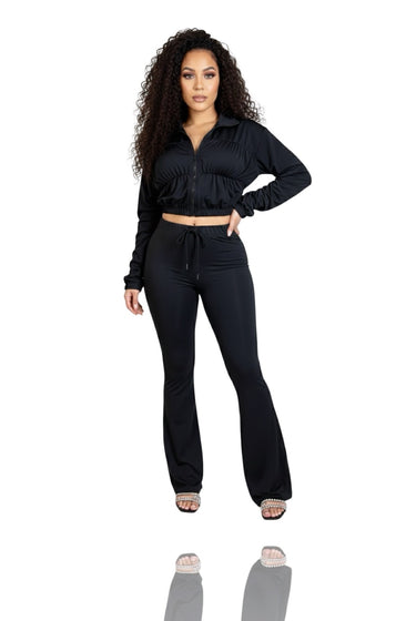 The cropped jacket features gathered ruffle detailing along the sleeves and bodice with a front zipper closure for adjustable styling. The high rise flare pants elongate the legs while hugging the hips for that smooth, contoured finish.
