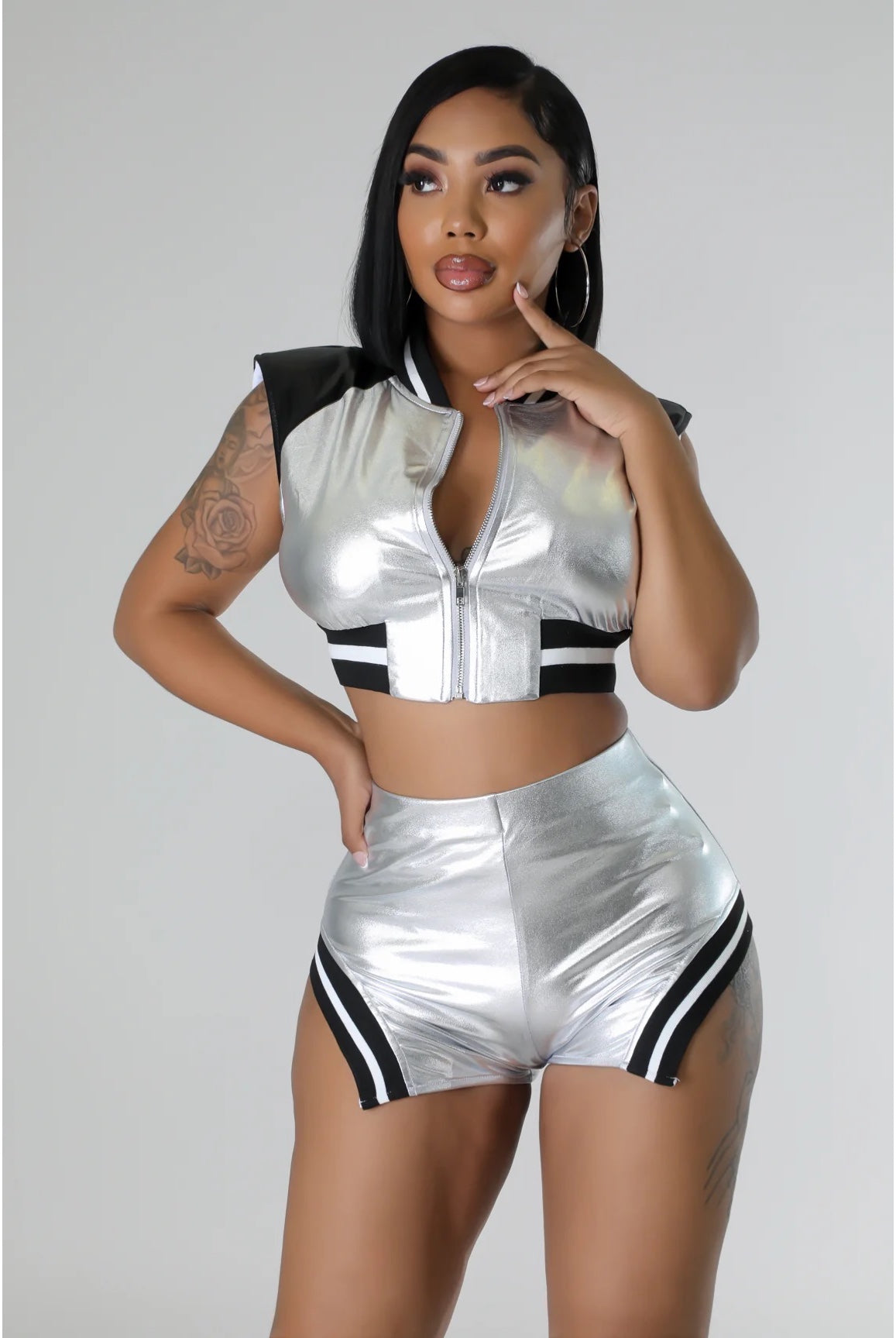 This stylish stretch short set features a flShine unapologetically in the Hottie Metallic Short Set a bold two-piece featuring a glossy finish that demands attention. The cropped zip-up top with a collared neckline pairs perfectly with high-waisted stretch shorts, sculpting your figure with confidence and attitude. Ideal for concerts, festivals, or any spotlight moment where turning heads is non-negotiable.