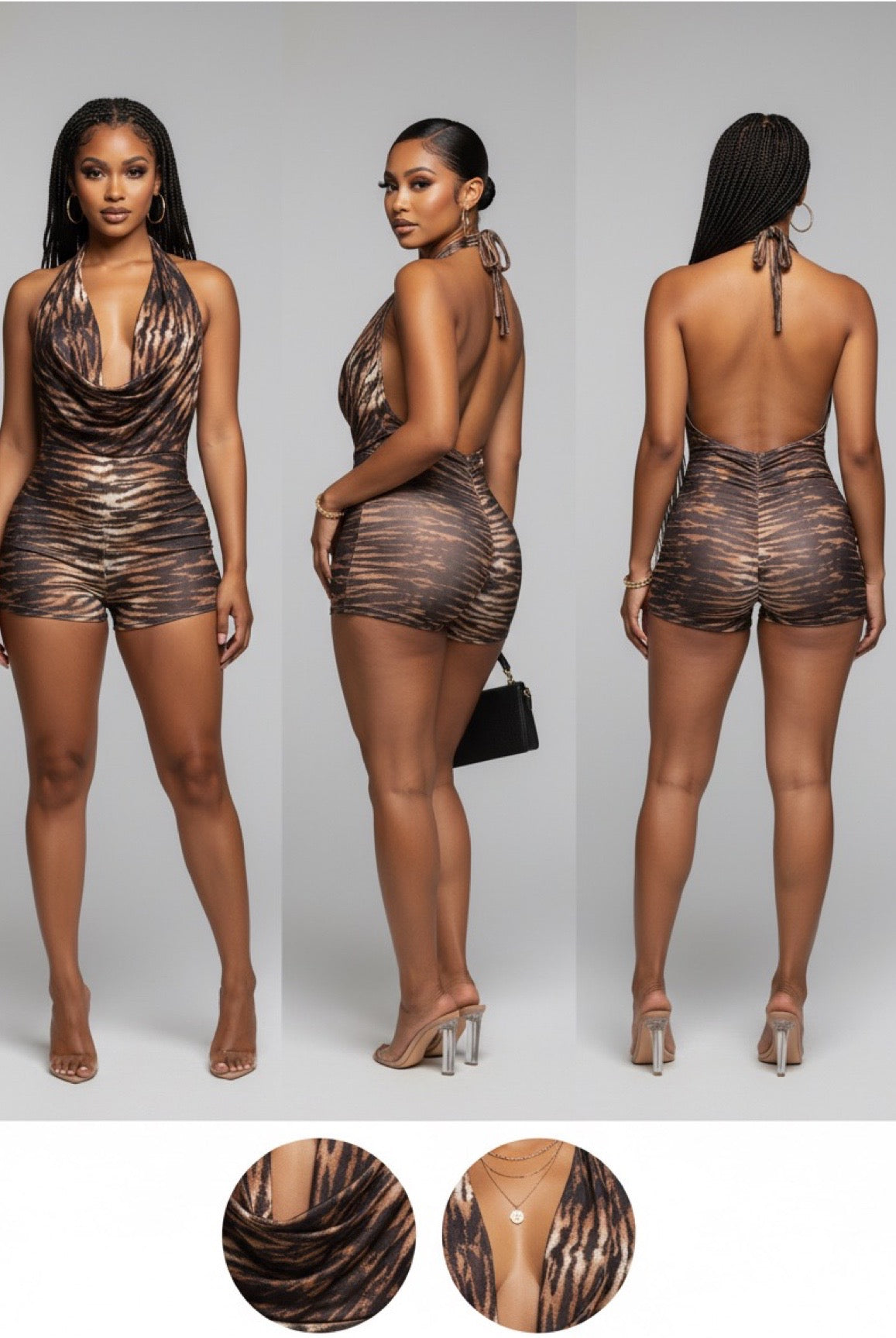 Unleash your wild side with this Zebra Print Halter Romper — made for bold babes who love to turn heads. Featuring a deep draped neckline, open back, and curve-hugging fit, this piece was made for nights when you want all eyes on you. The metallic sheen adds that extra shimmer that hits just right under the lights.
