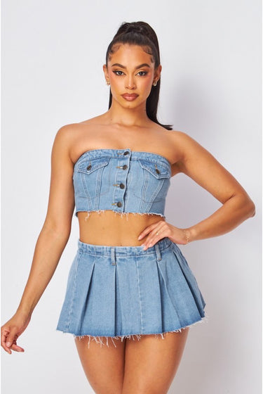 Elevate your style with our Denim Matching Pleated Skirt Set! The sleeveless top and pleated skirt effortlessly combine for a chic look. The skirt's side zipper ensures a perfect fit while the no-stretch fabric offers a flattering silhouette. Step out in confidence and style with this versatile set.