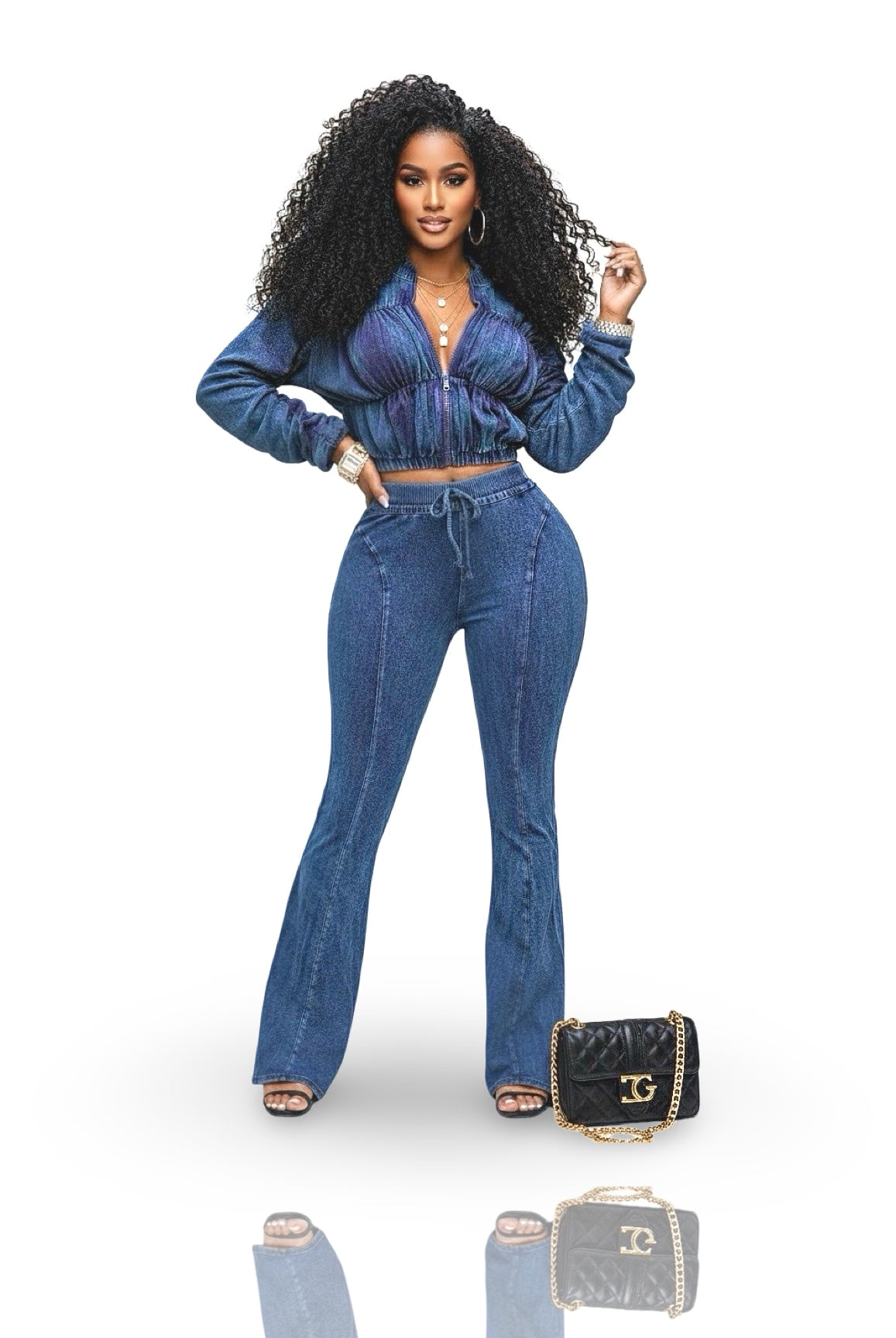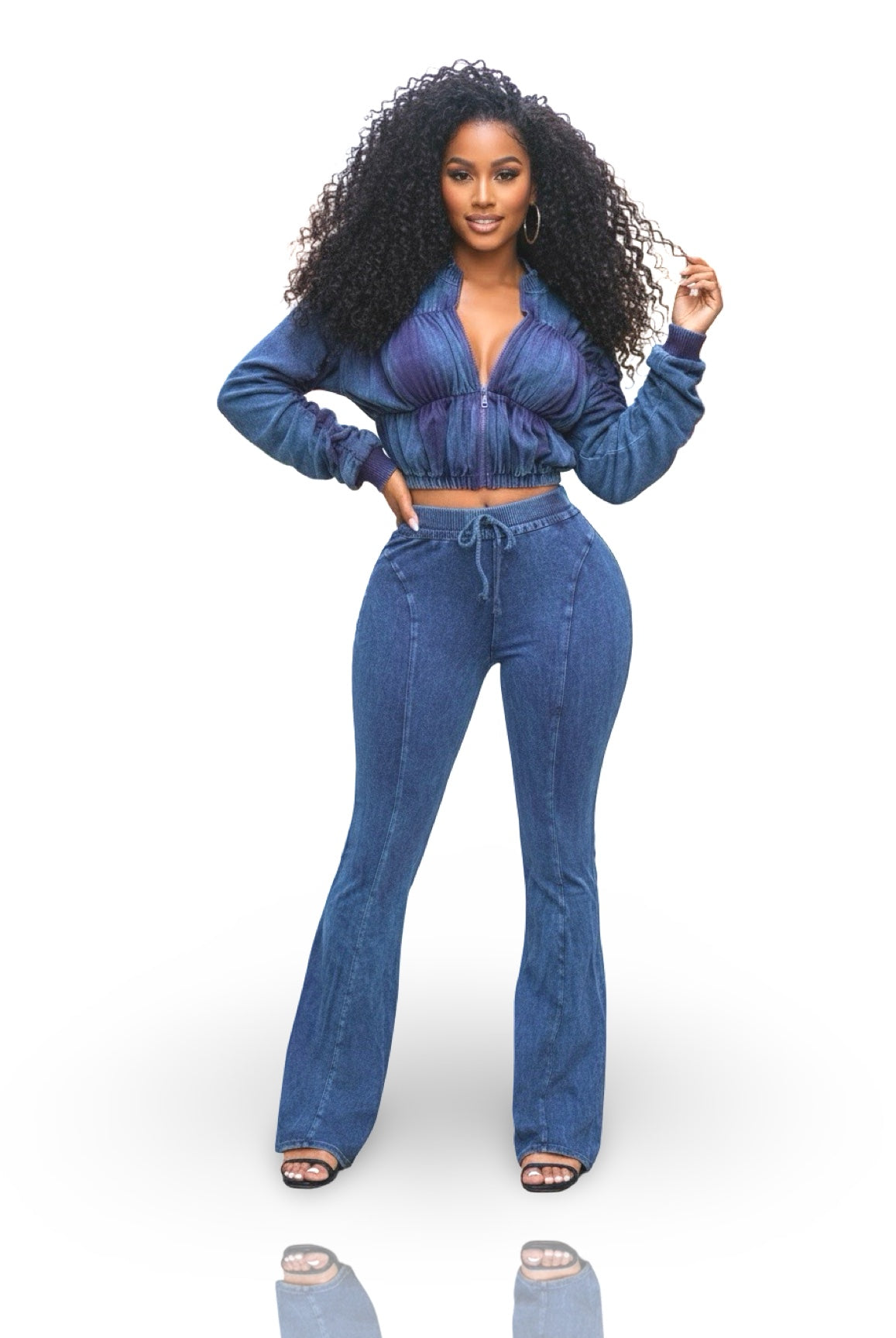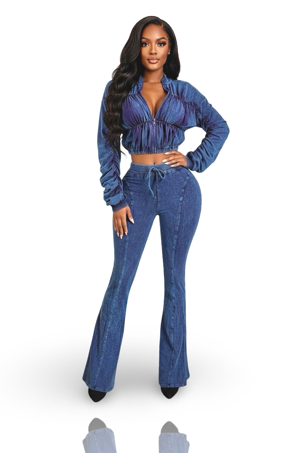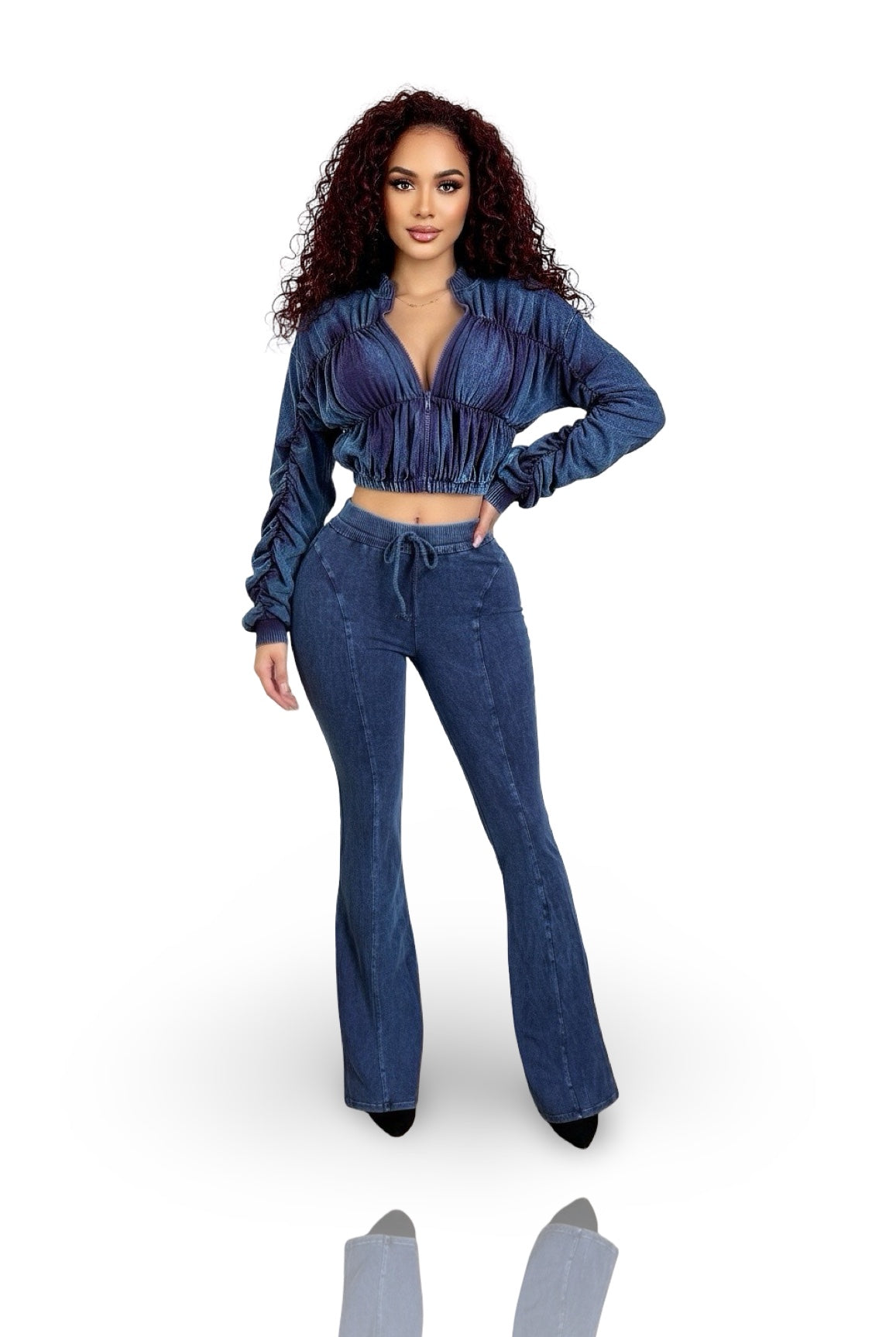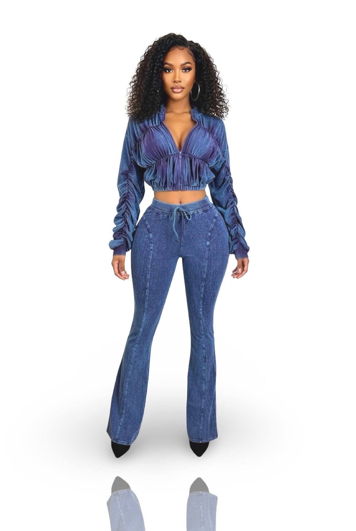 Solo Mission - Mineral Wash Zip-Up Shirred Crop Jacket & Flare Pants Set